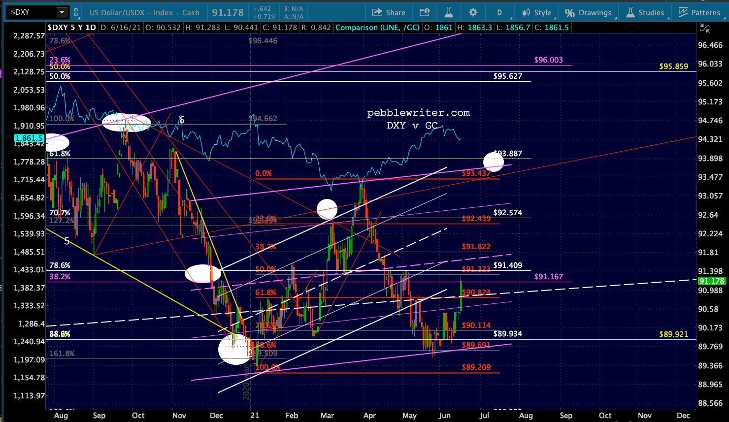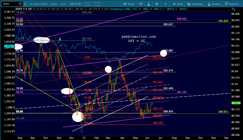 USDJPY also remains ready to rally to whatever extent it takes to protect stocks. It has already broken out of the falling purple channel. If it doesn’t like Powell’s comments, it has very good support at the white .618 at 105.78. But, all it has to do to help stop an equity correction is top 110.96 – with plenty of upside targets after that.