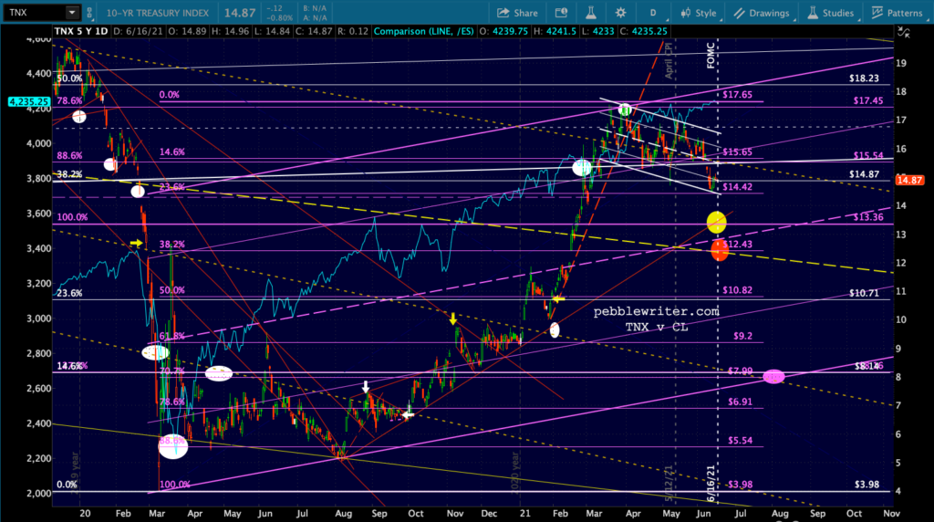 The EURUSD can largely offset the move by backtesting either the SMA200 of the rising red TL. But, it doesn’t matter all that much as DXY would have to rally quite a bit to alarm equity investors. It might, but it’s not all that likely if the Fed hints at even lower interest rates unless they also hint at tapering.