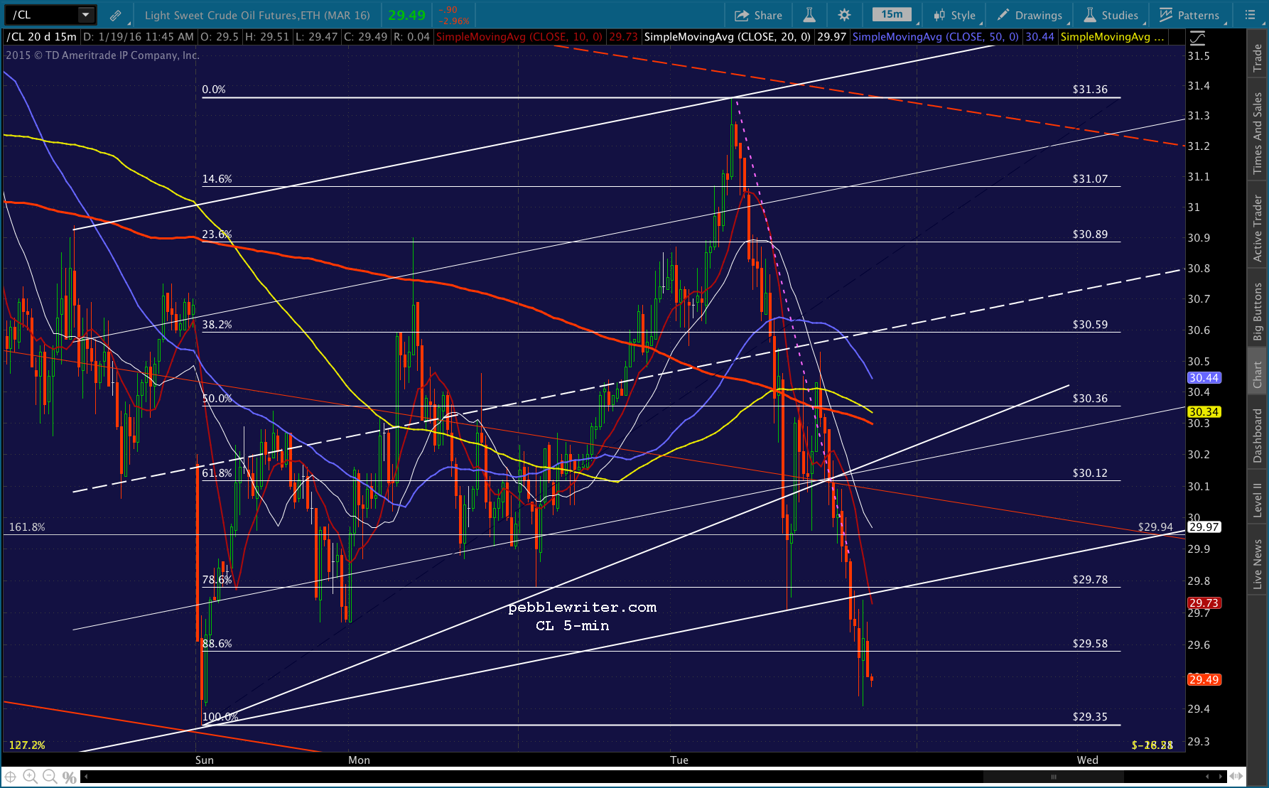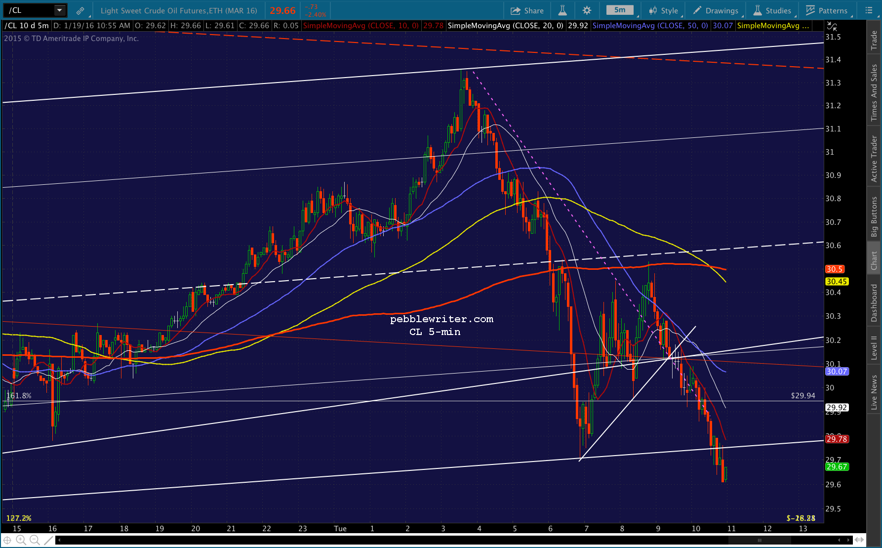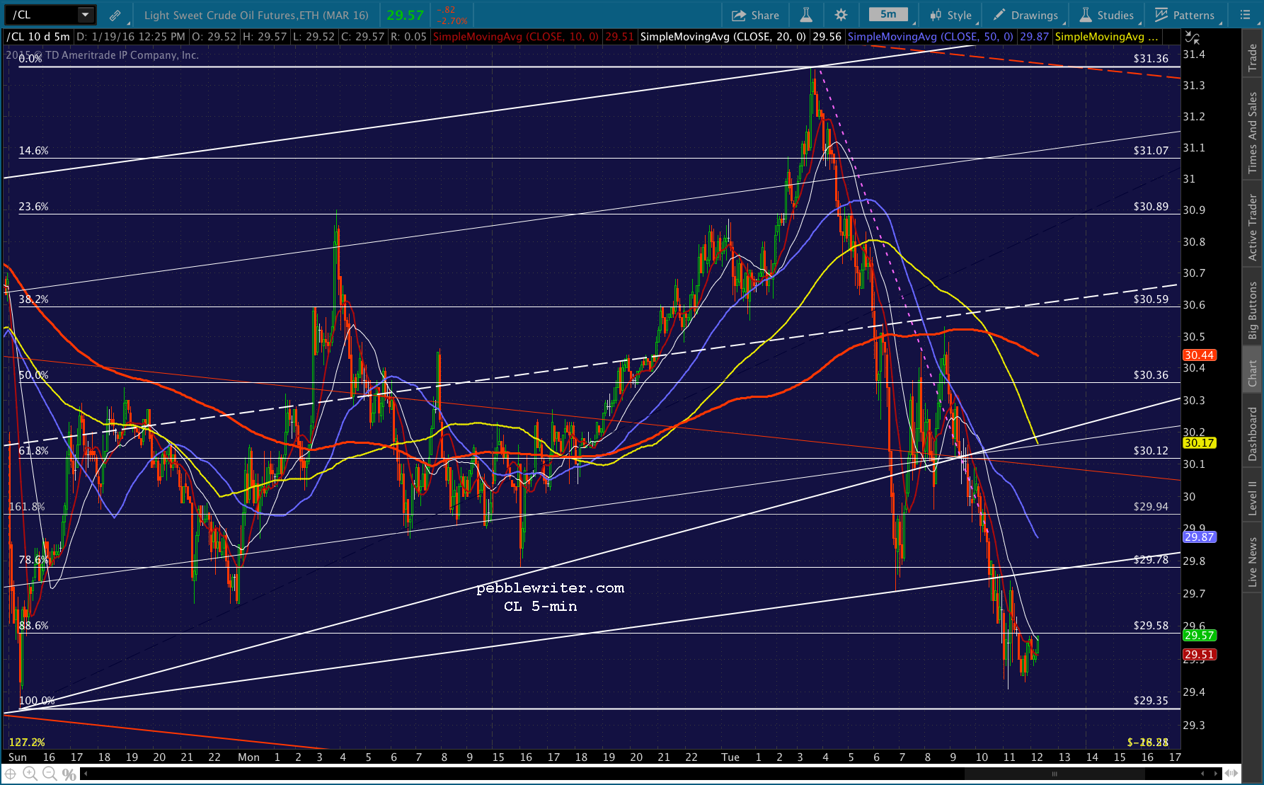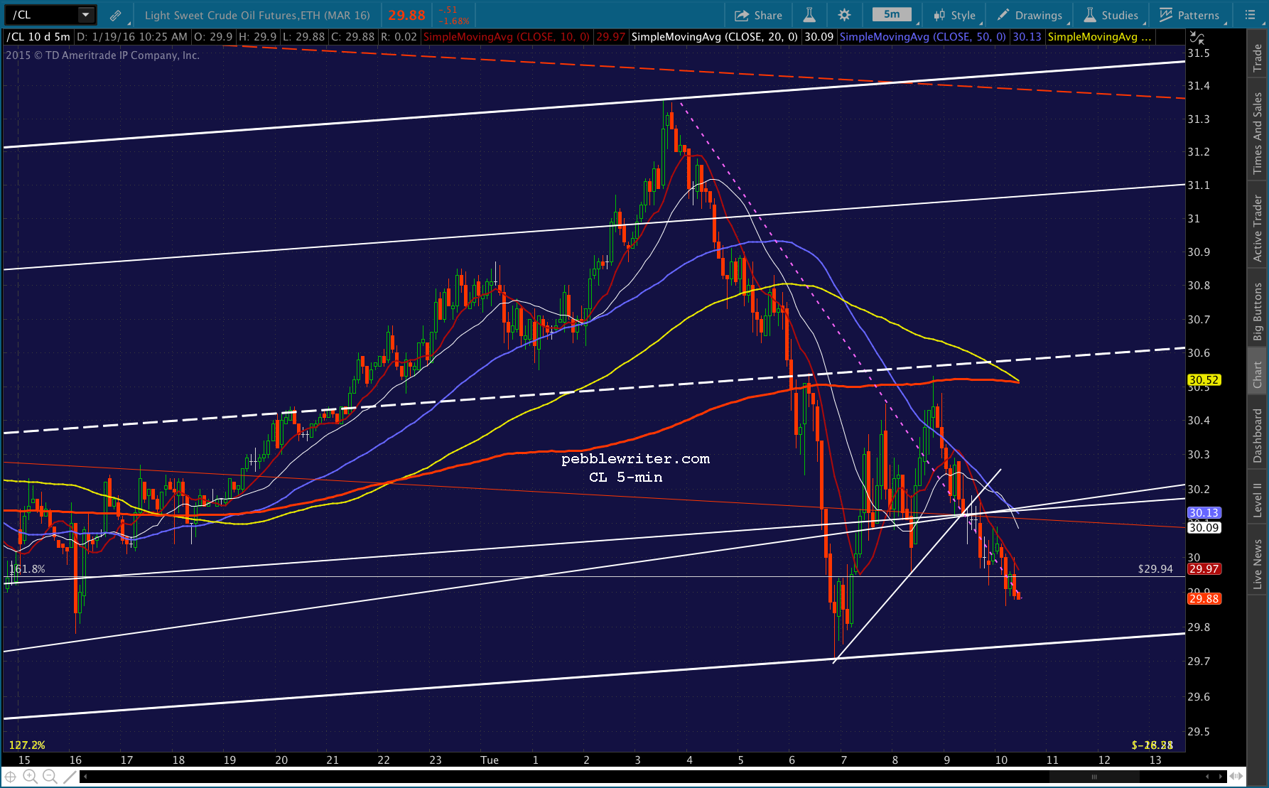 I’ve been behind a little bit all day — slow drops and fast rebound. Didn’t think it would dip below the red channel bottom, and thought the rebound would at least pause there. If SPX closes back above the H&S neckline at 1880ish, it’s a positive close and we should see some follow-through tomorrow. But, CL is closing weak and could easily be headed for 28.80. I’ll post an update on CL and GC after the close.