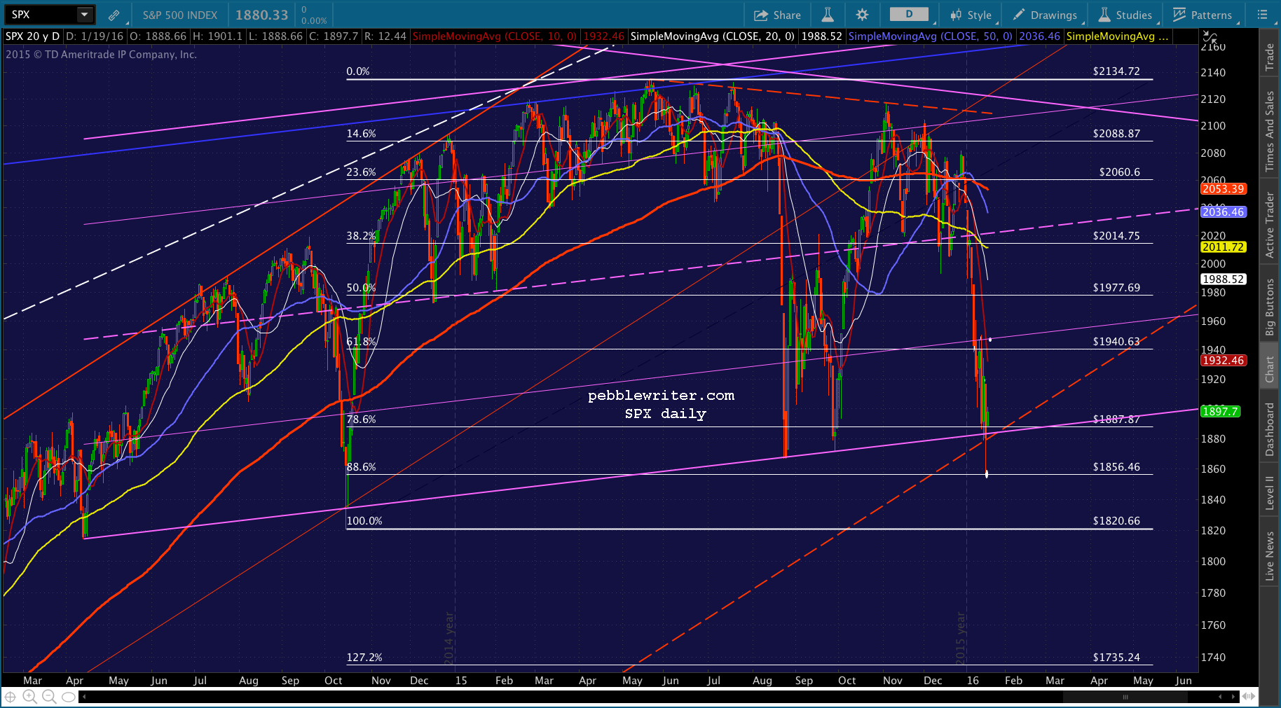 As discussed in our big picture post last week, 1856 was a critical level for the bulls to hold — from a channel, chart pattern and a Fib standpoint. A drop through the neckline of the large H&S Pattern would target 1630. So, I expect TPTB to bring out whatever ammunition it takes to keep things on the rise.