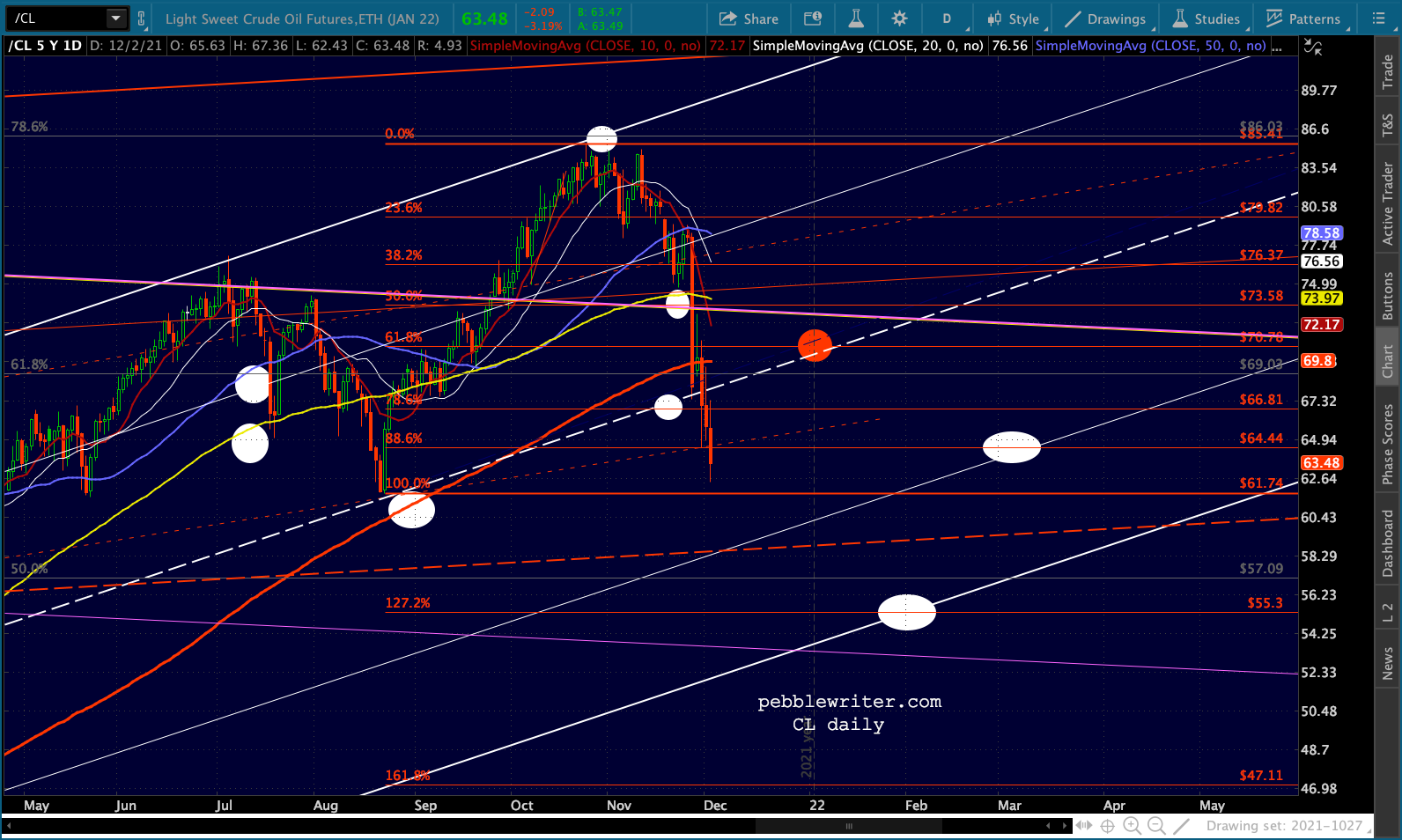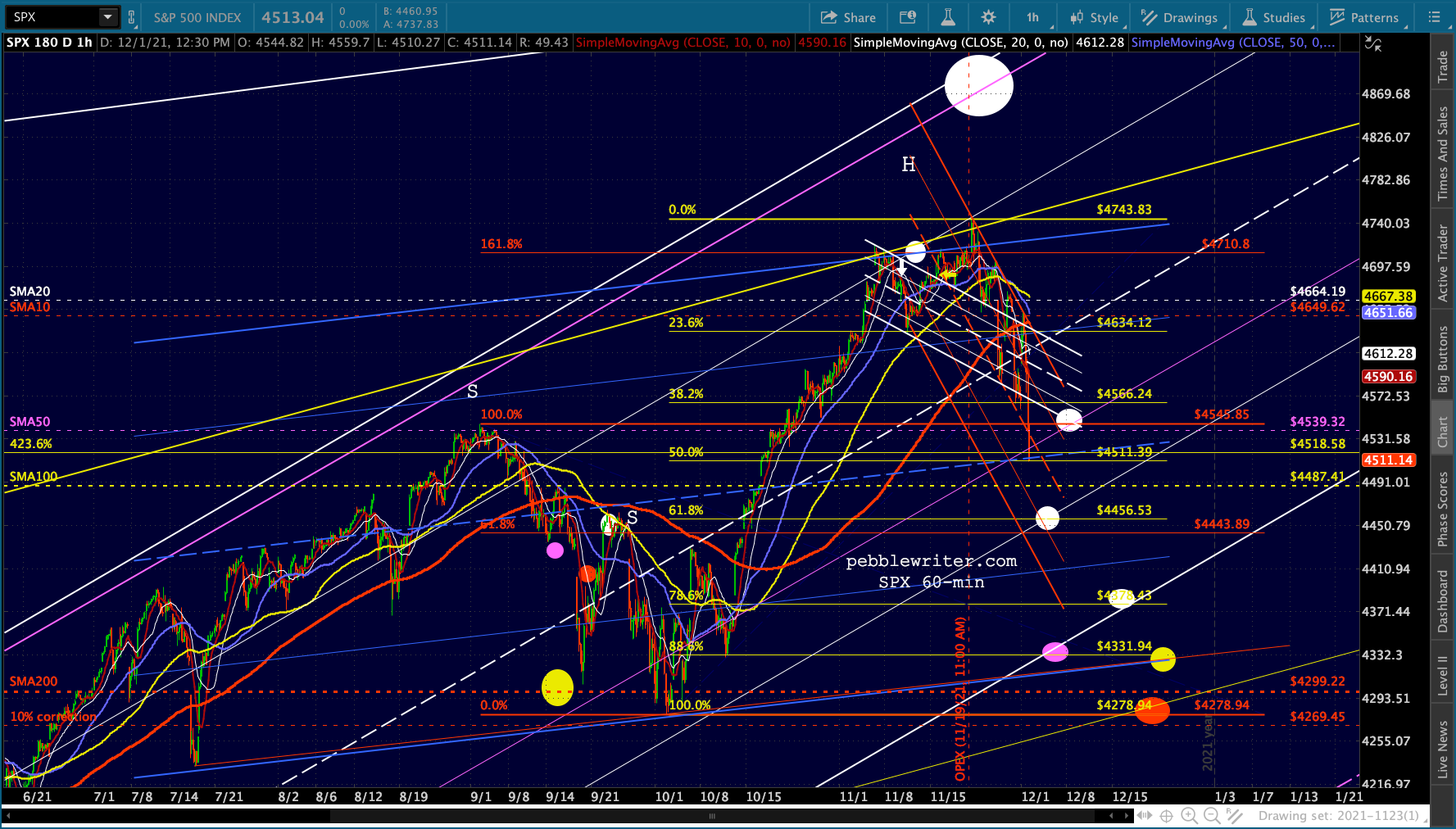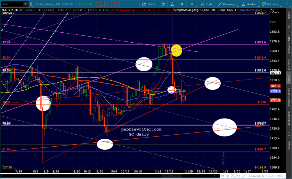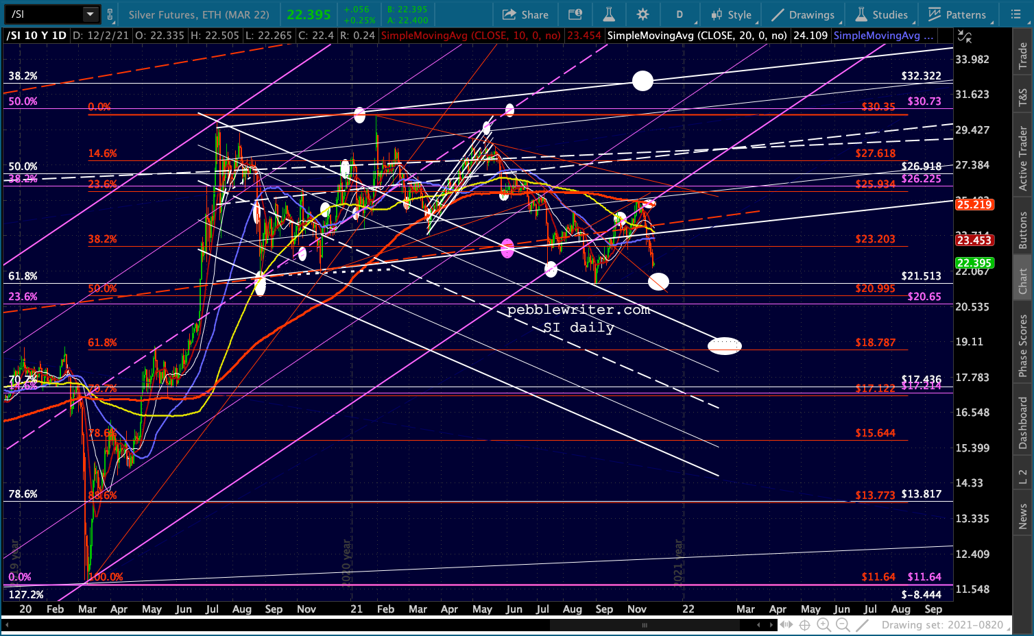 SPX illustrates the logic of the .618 Fib target as it intersects with the .236 line in the rising white channel.