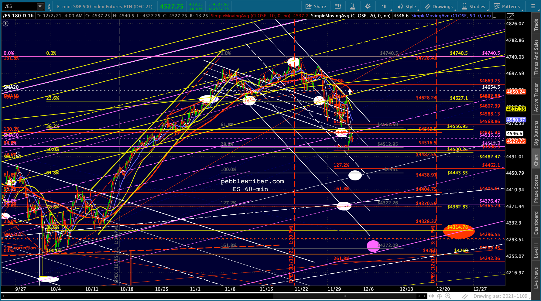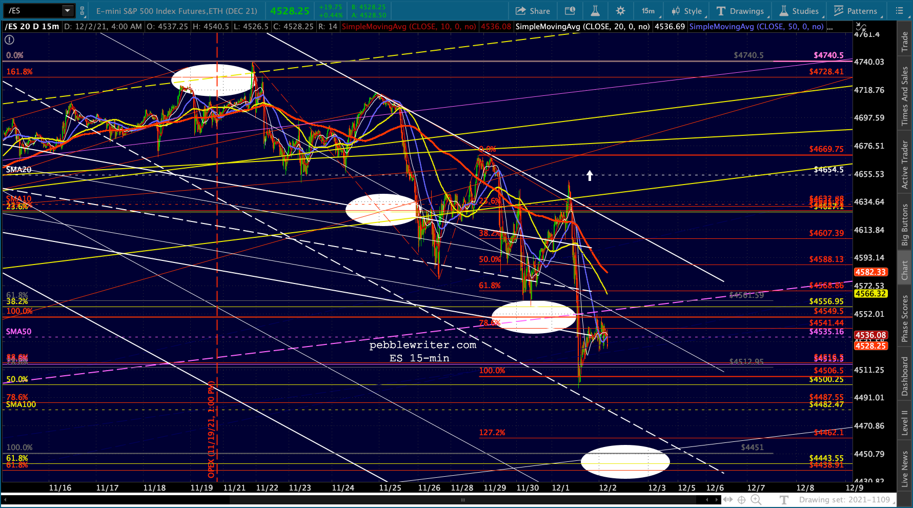 Futures are currently up about 20 points, but fading as we approach the open. If VIX has anything to say about it, ES will at least bounce here at the channel midline and SMA100. The downside potential, however, shouldn’t be ignored. ES and SPX both have a .618 Fib which looks even better as a downside target.