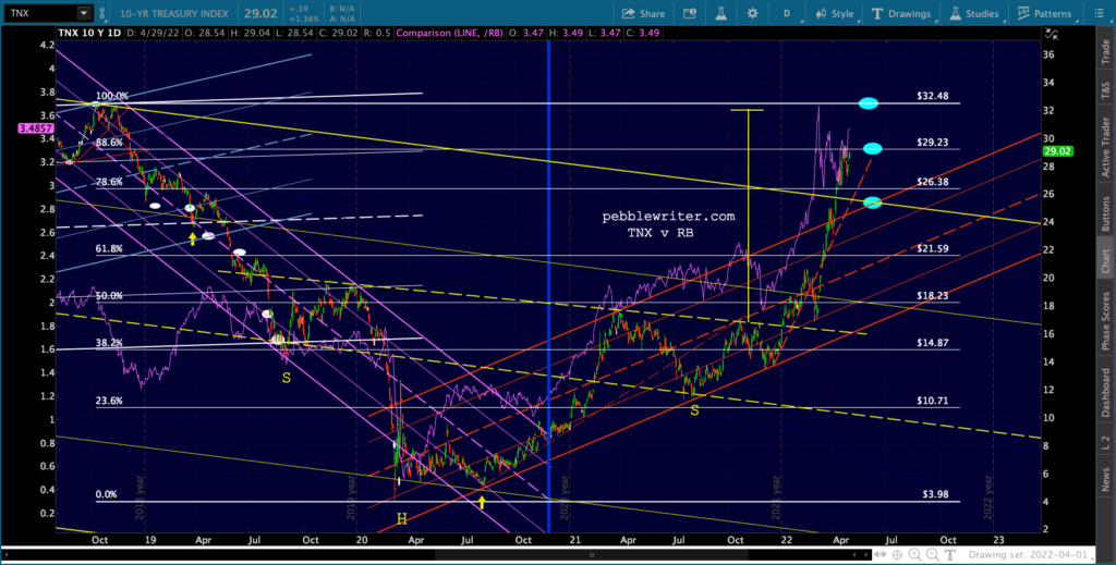 TNX is following CL’s lead, regaining the ground it has given up since reaching 29.23. While a backtest of the channel top would be normal, it’s not necessary. As long as it remains above 29.23, the 32.48 former top and IH&S target should be the 10Y’s next stop.