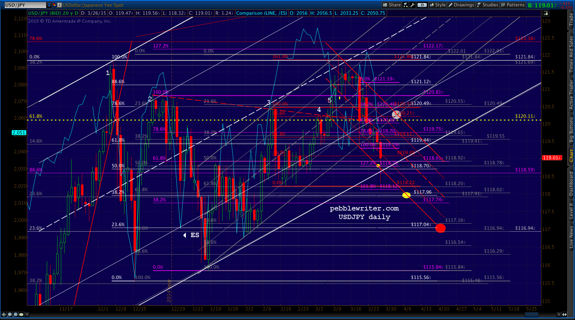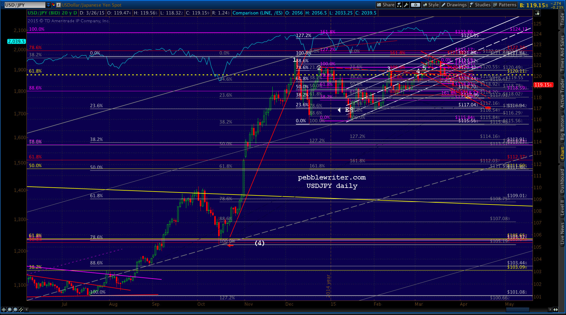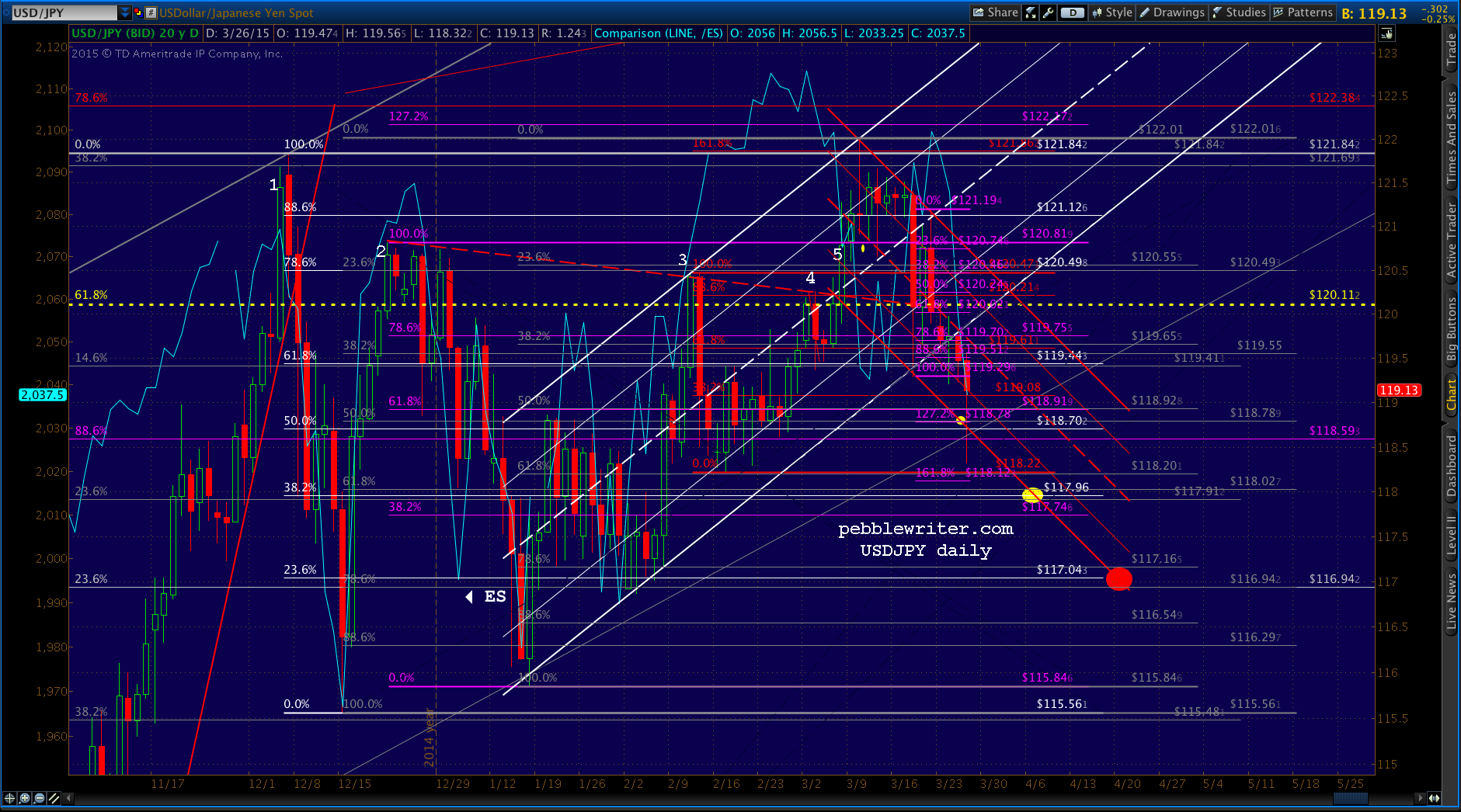 Come early May, they’ll have to decide between that channel line and the .618 at 120.11 — which the pair has closed below 4 sessions in a row. The bearish case would require that this white channel (and gray .786 line) break down at some point.