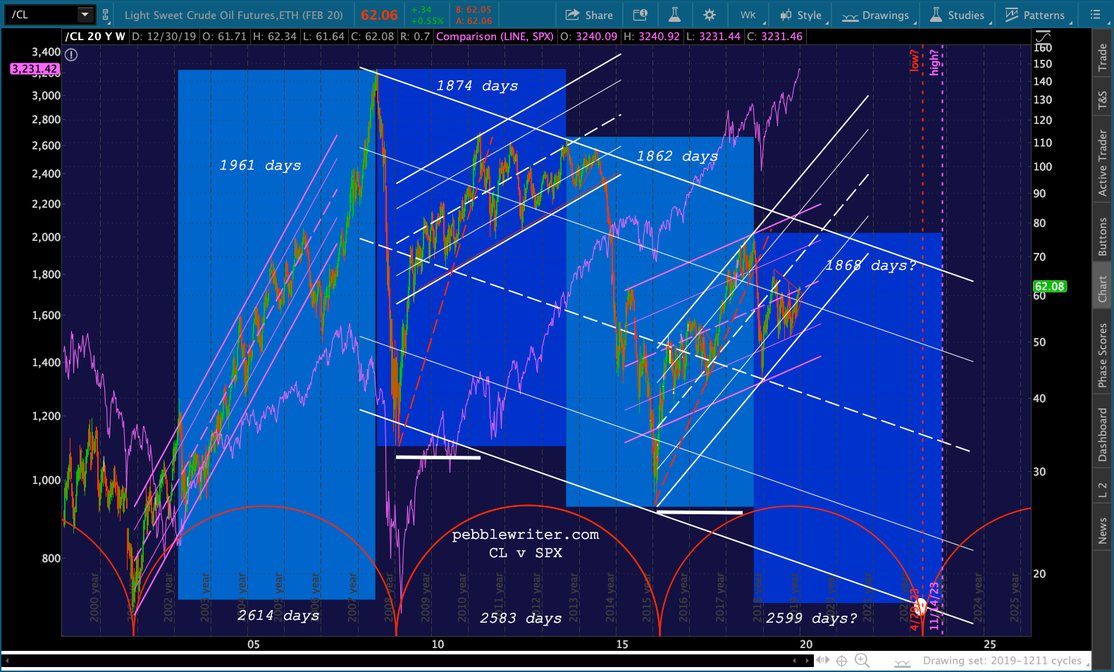 A third cycle of 2599 days (the average of the two) would end in Apr 29, 2023. If the large falling white channel were to continue working, the price target would be in the neighborhood of 17.50 — very close to the Nov 2001 low of 17.12 which came amidst the 52% crash in SPX between 2000 and 2003.