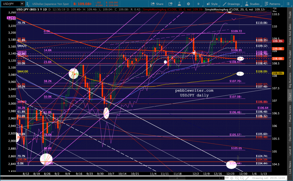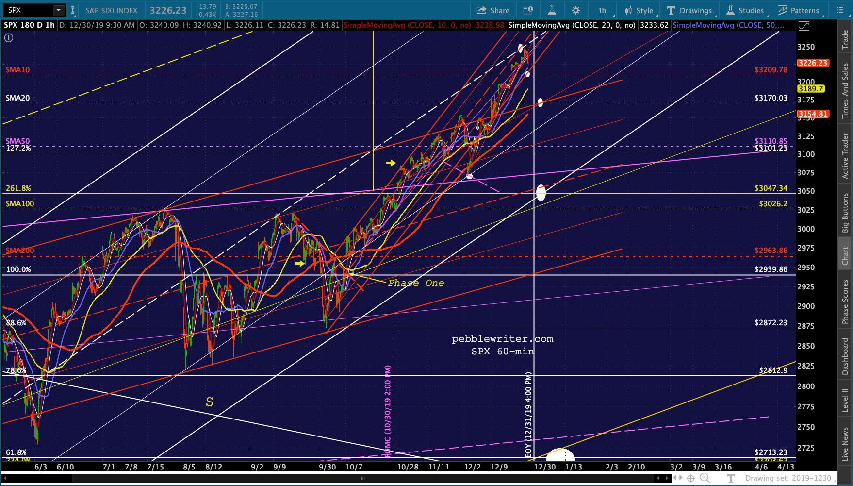 If the SMA10 finally breaks down, the red channel bottom intersects the purple 1.272 and SMA20 at 3177. If it could hold out until Jan 3, it would backtest the broken purple channel top.