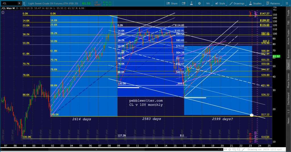 Now, back to the oil cycle… Note that the cycle lows have all been extreme and very well-defined. The 2009-2016 cycle of 2583 days was 98.8% of the duration of the 2001-2009 cycle.