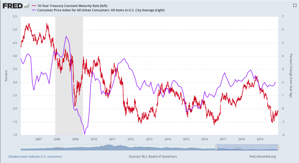 If we examine a closeup, we can see that the 10Y crept above 3% last year when CPI nearly reached 3%.
