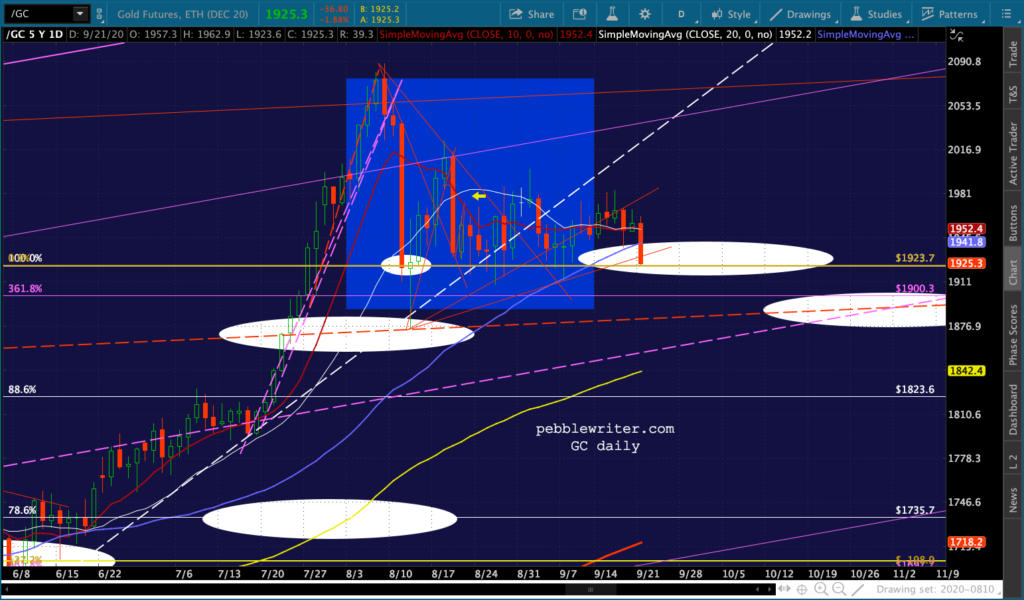 …while GC almost made it back to the 1923.70 former high after getting a bounce on the red TL midline.