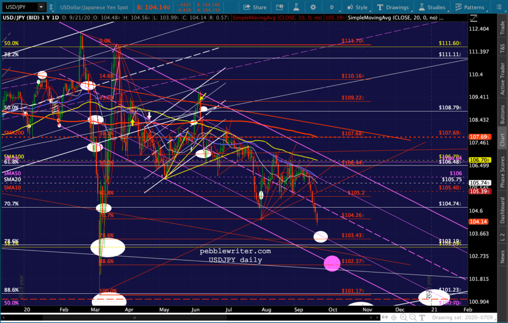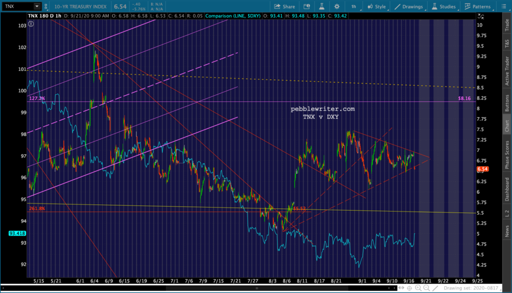 DXY’s strength is taking a toll on silver and gold. SI has dipped below its .382 at 26.255 and broken down below its upper TL.