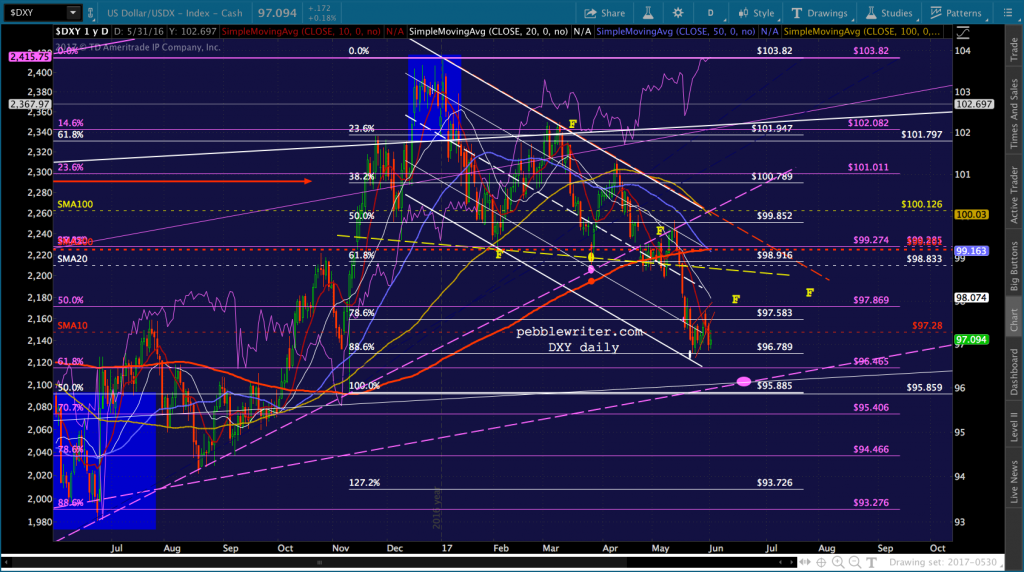 Note that ES has a little further to go to reach the yellow channel top — closer to 2428, also its IH&S target. SPX’s IH&S target is still higher at 2430, so I view this as a pause more than anything. I’d be surprised if it dropped much — say, 2420? BTW, there is no harmonic justification for a reversal here. That would have required a reversal at the purple .786, which obviously didn’t happen.