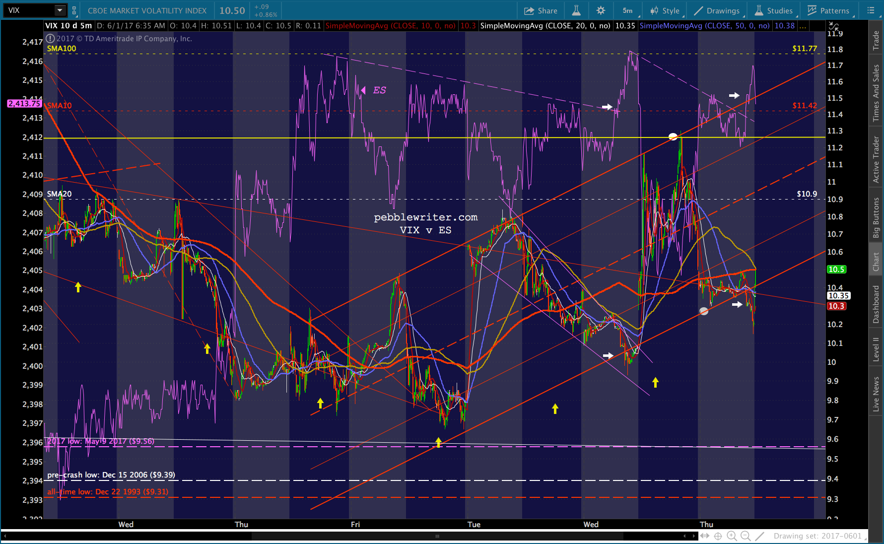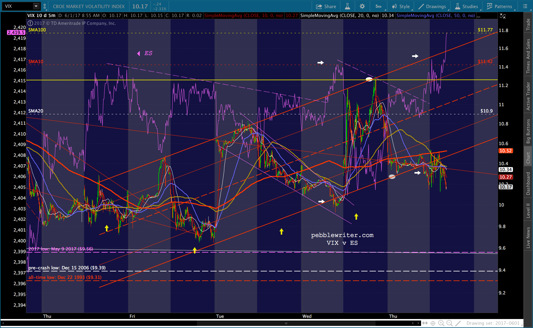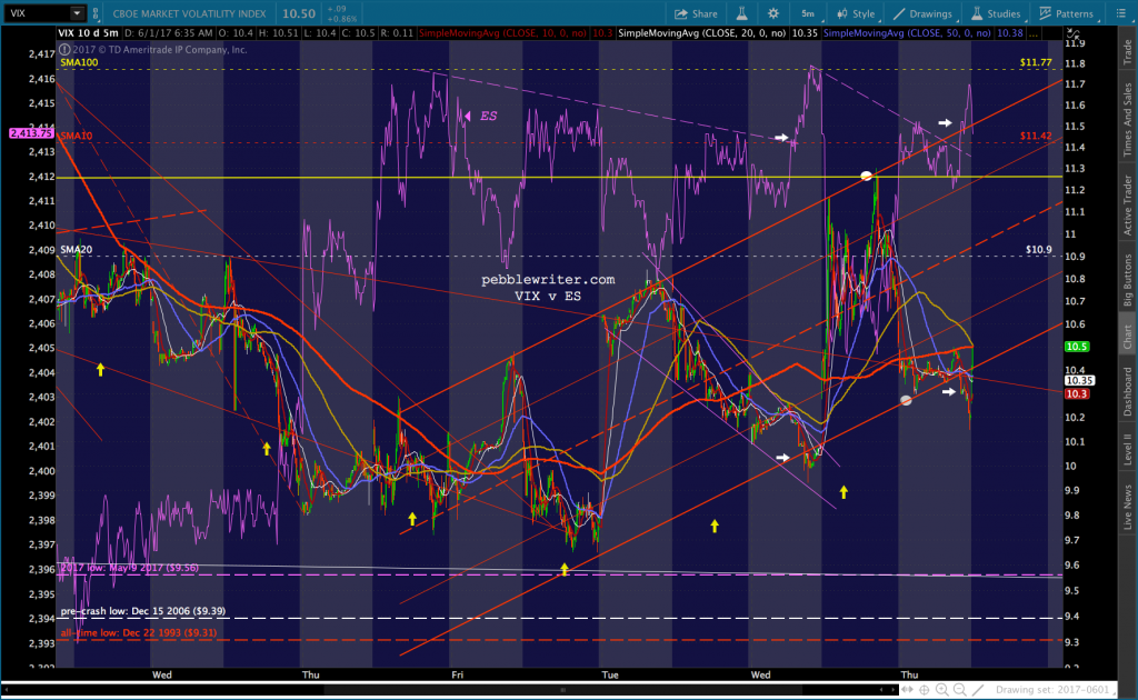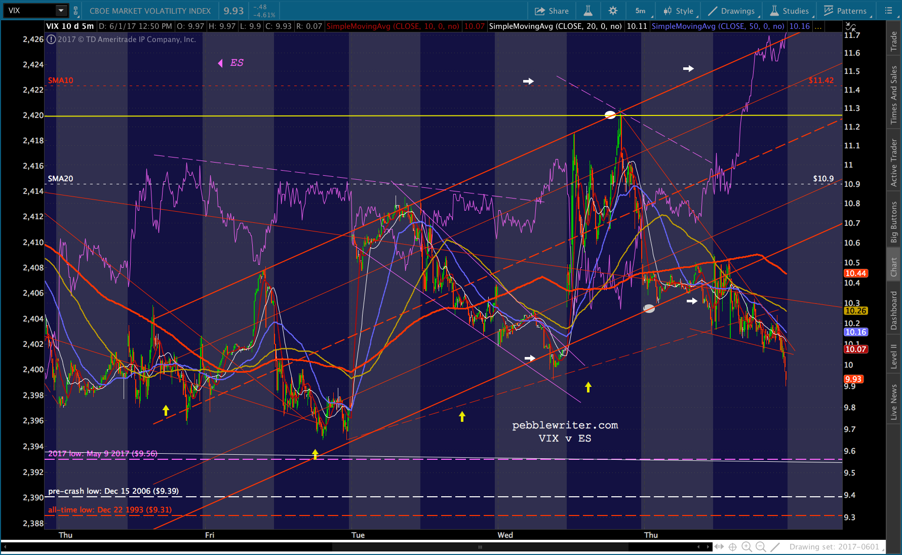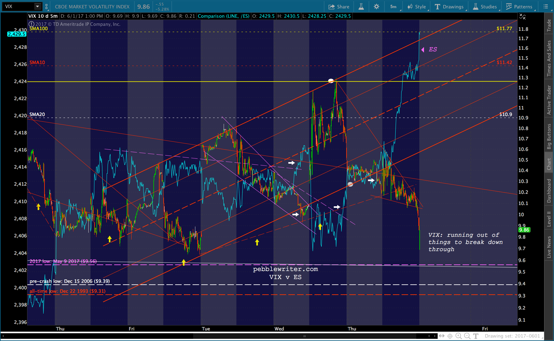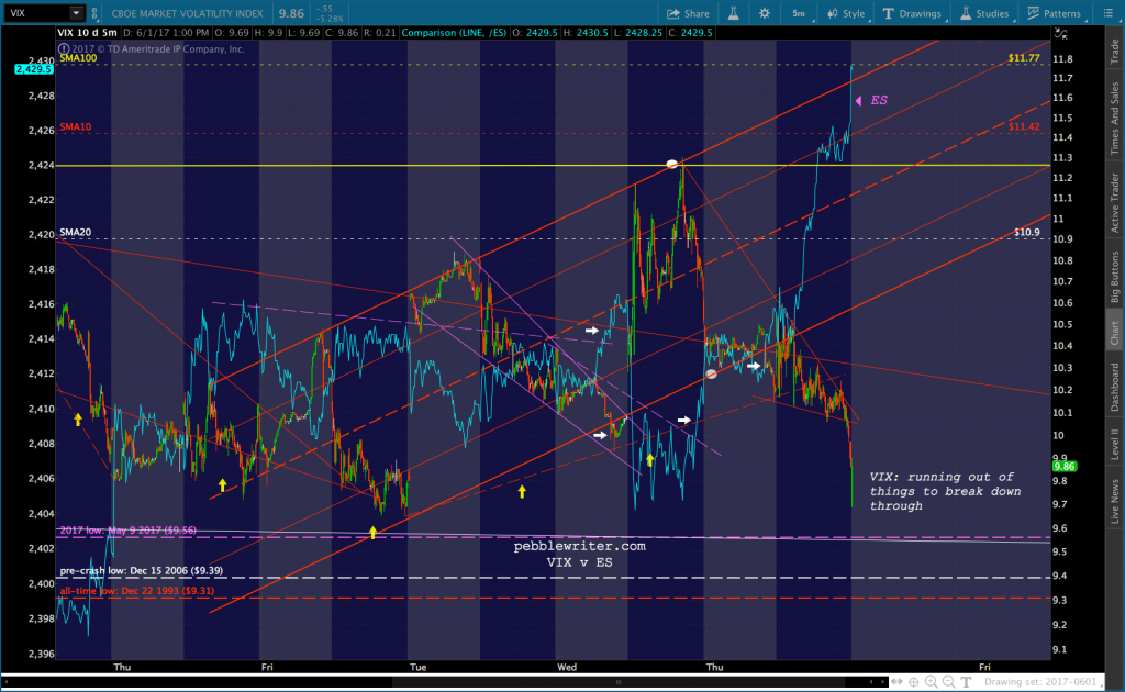 ES just reached the yellow channel top and IH&S target. It’s a good thing, too, b/c VIX has run out of things to break down below. SPX stil has a couple of points to go before reaching its, but I’d rather exit here with ES’s tag. To short for those who can hedge or deal with the overnight gap risk.