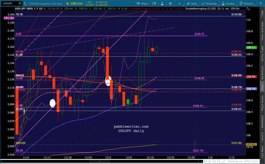 They should have no trouble maintaining these levels or higher as long as USDJPY continues to melt up. Note that in addition to yesterday’s golden cross the SMA10 has crossed the SMA20. The pair should test the purple TL at about 109.82 and, if necessary…