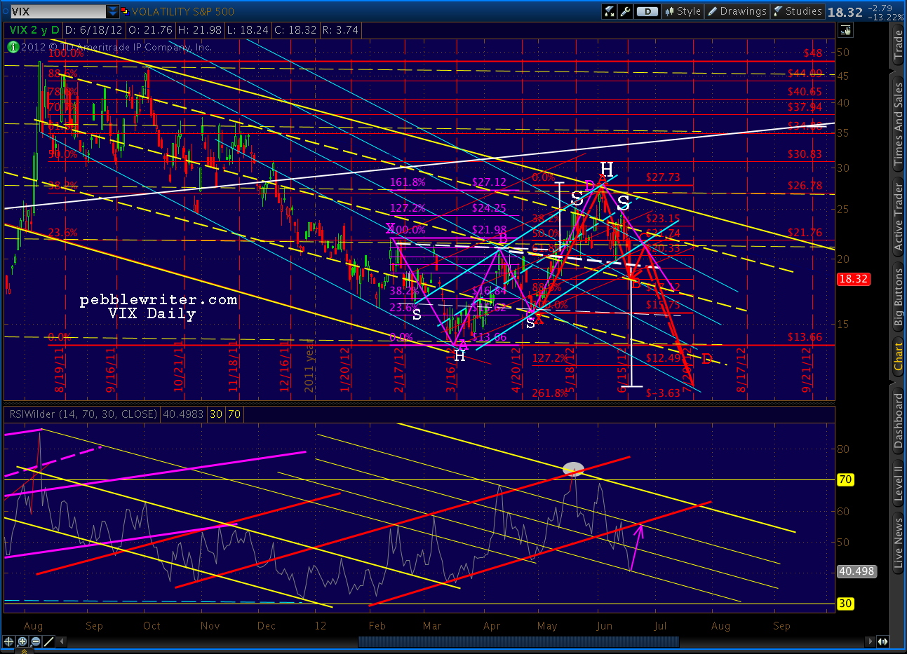 We’ve hit three bulls eyes in a row with VIX — including the interim top on April 10 [see: Bottom Fishing], calling the June 4 high of 27.12 back on April 18 [see: VIX at a Crossroads] and, now this. The fourth will be a little trickier.