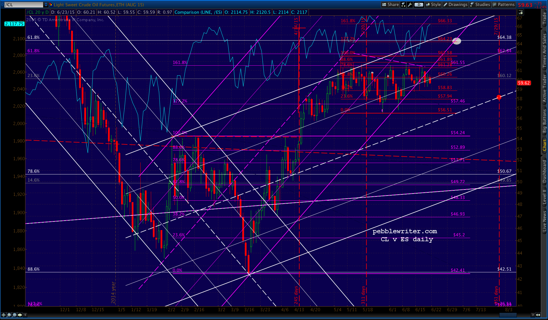 The red channel would have worked beautifully, but we have only the gray one to rely on now. And, it doesn’t reach 2050 until early July. The only problem with that is TPTB’s tendency to ramp prices up over long holiday weekends, not down. With the July 4th holiday approaching, any potential plunge to 2050 had better get started very soon.
