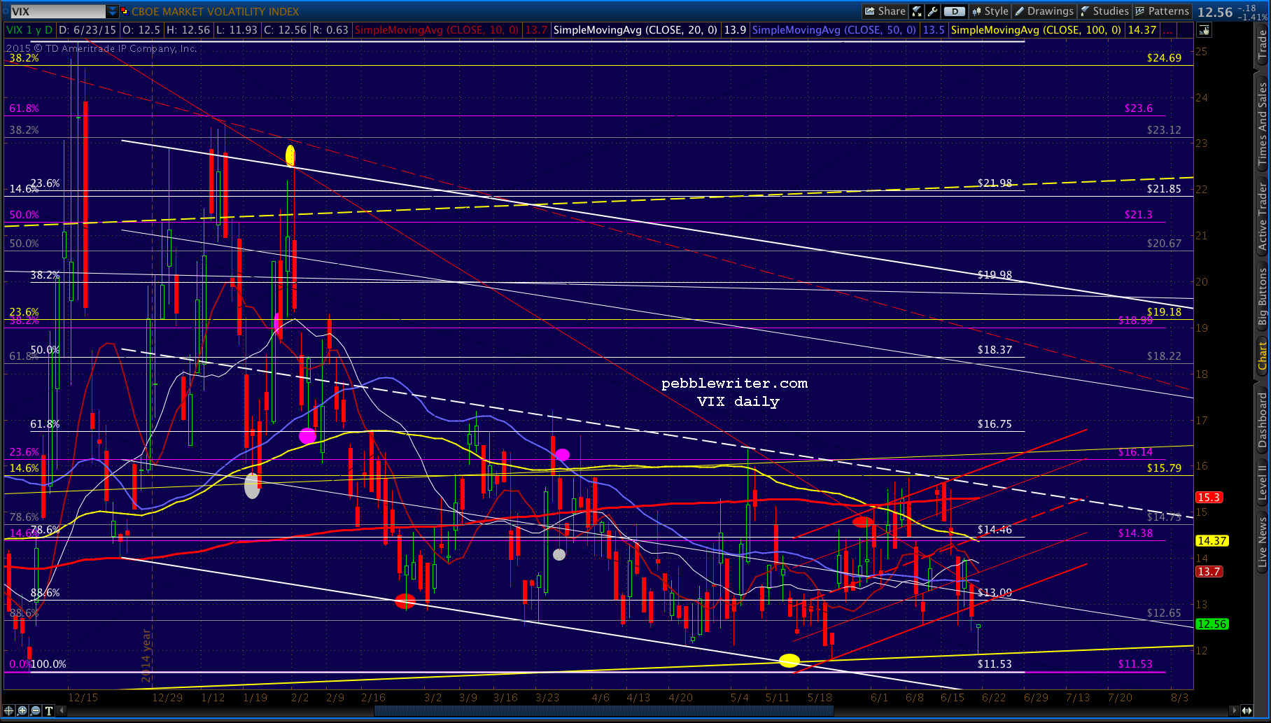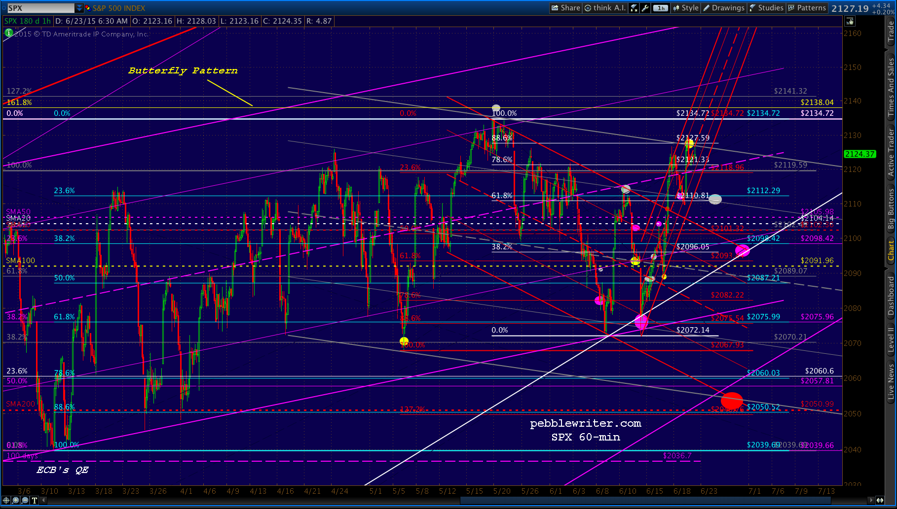 For now, I’m inserting a new downside target (purple) at 2096 — intersection of the white .382, the broken red channel top, the rising white channel bottom and — in a few days — the SMA100.