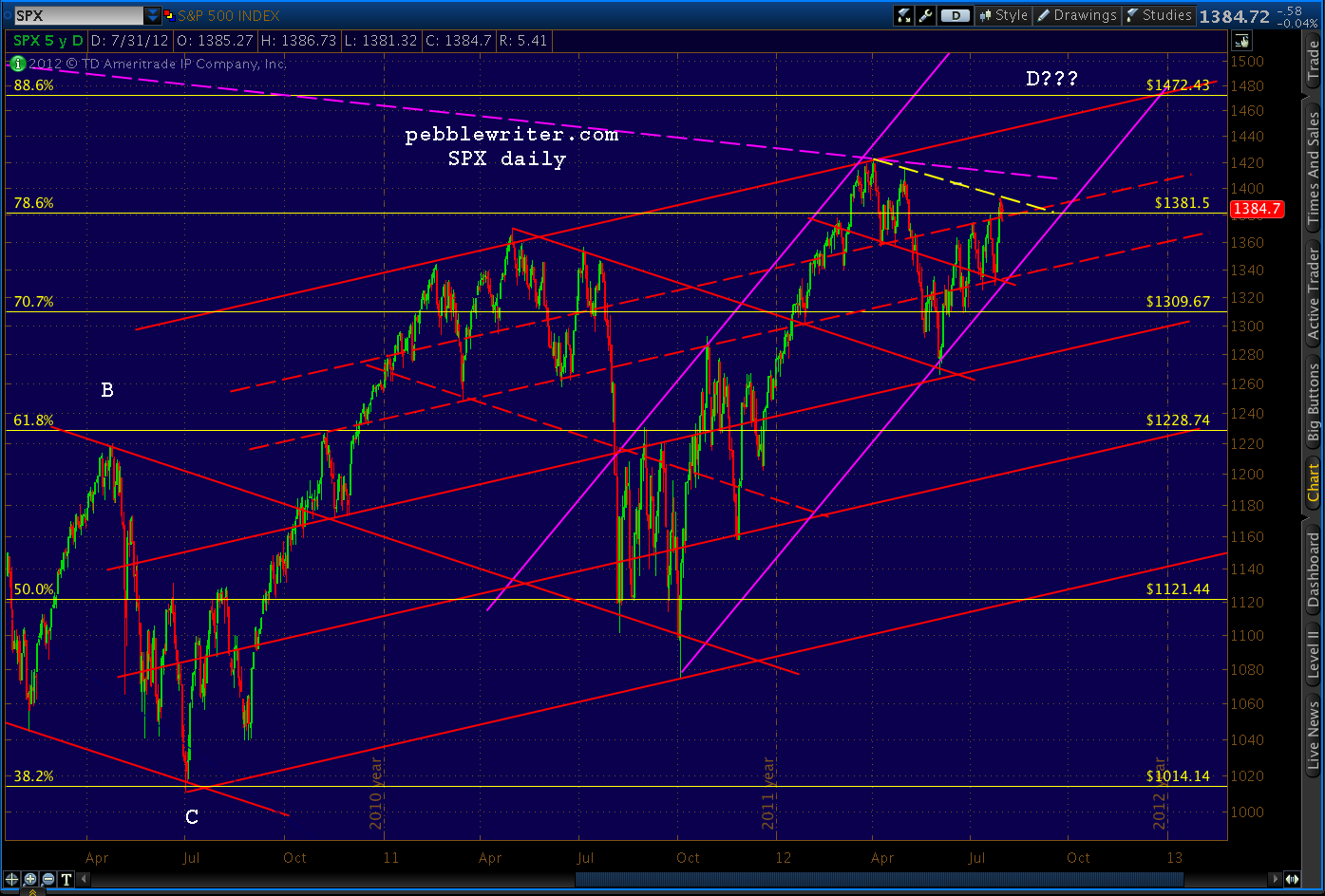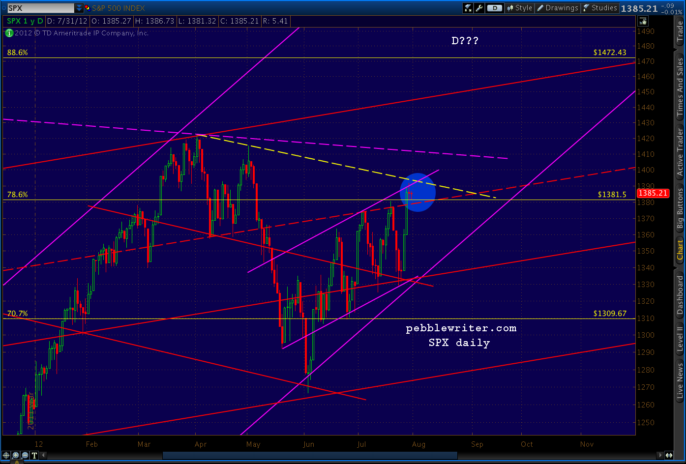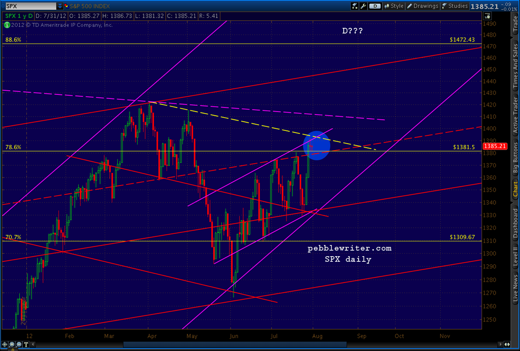 At first blush, the market seems to be respecting the last high of 1380.39 on July 19. I suppose it makes for a more positive wave structure.