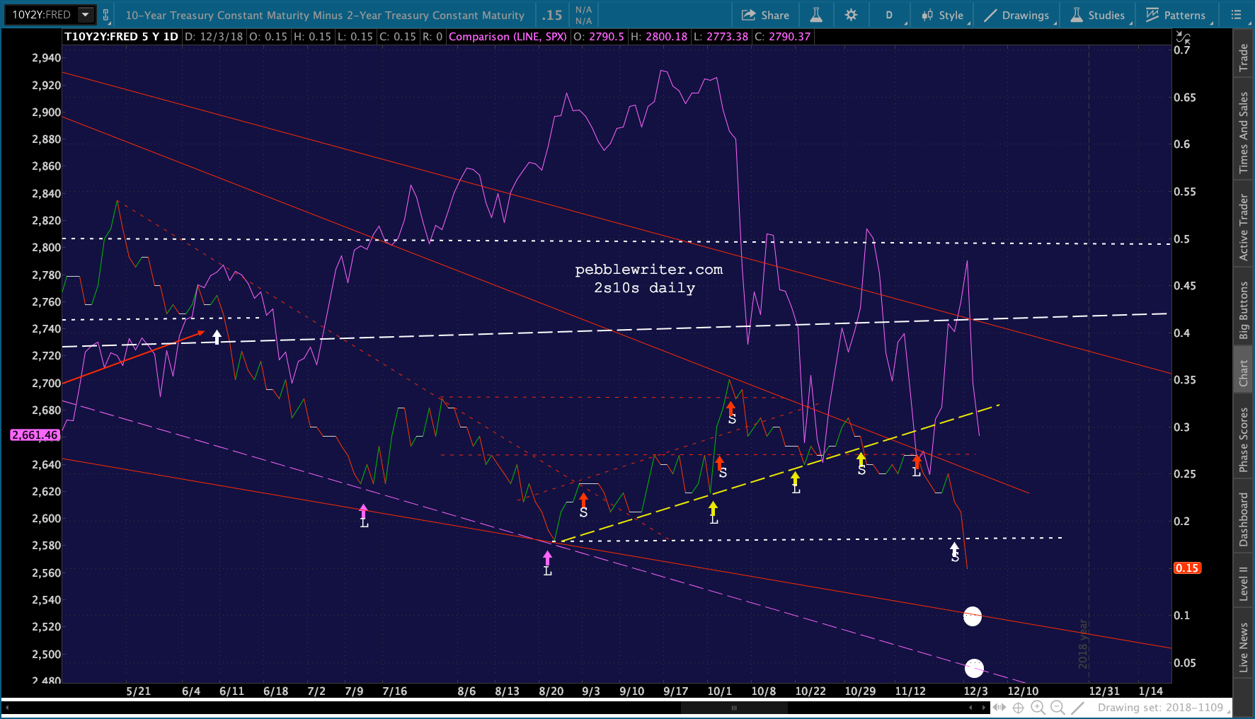 Broad strokes from the most recent formation… Note that 2s10s just dropped through the white support line, indicating further downside.