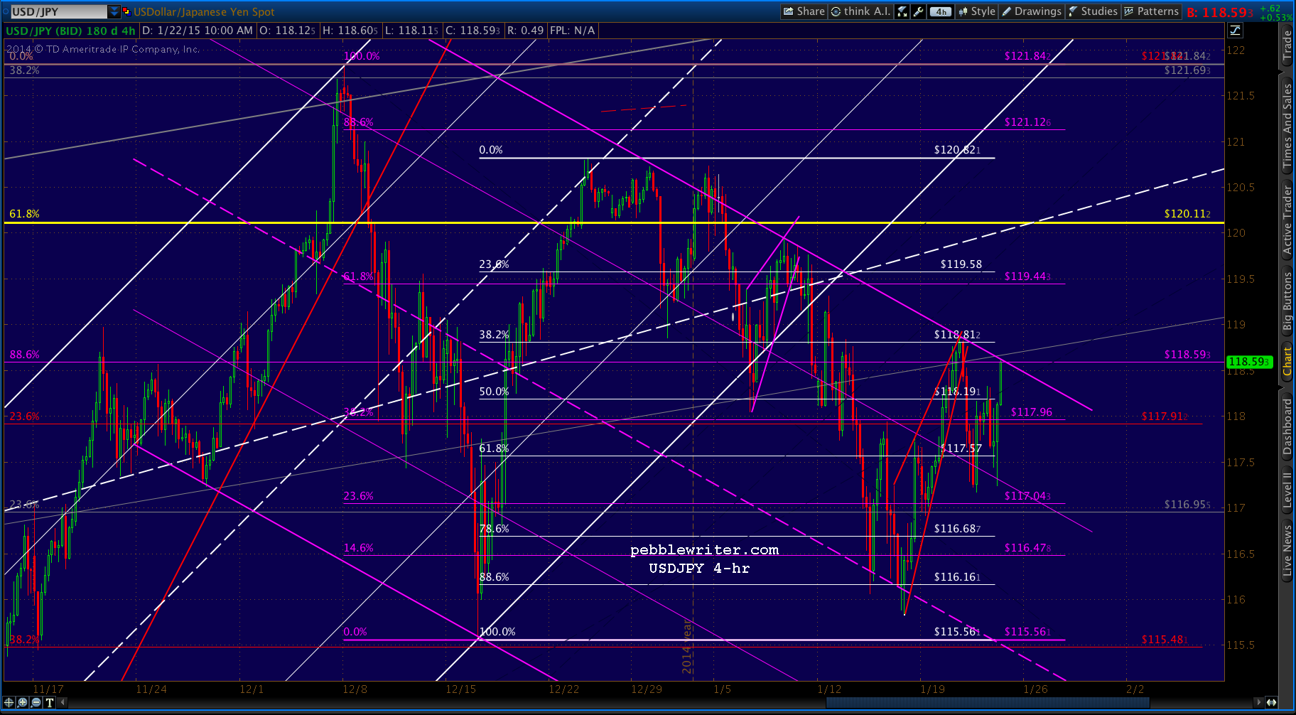 I also like the fact that USDJPY came to a screeching halt at the top of the falling channel we’ve been tracking for several weeks. A reversal here and continuation of the downturn supports the idea of a drop in stocks.