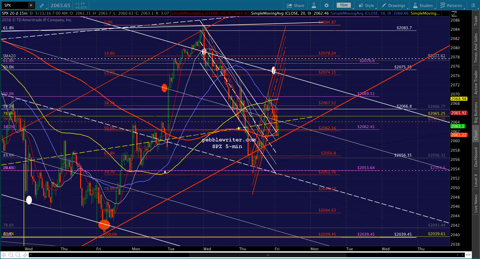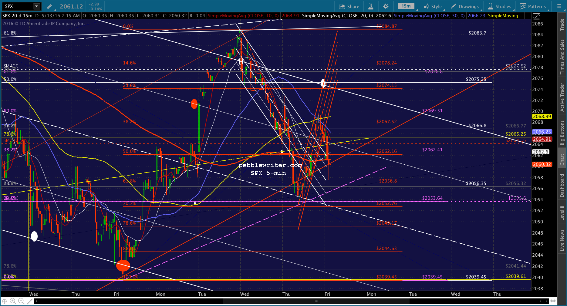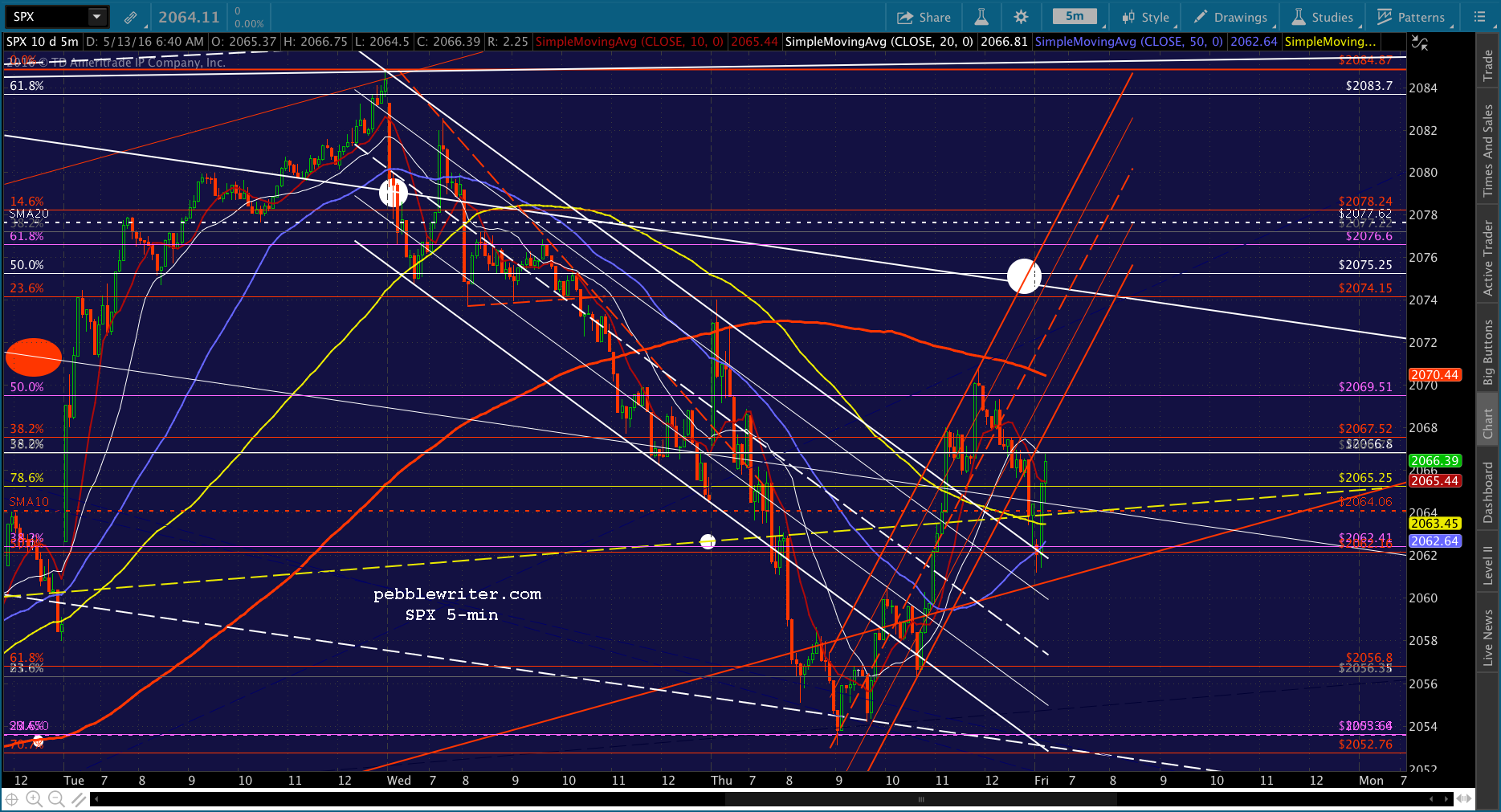 SPX has rallied above the neckline to the SMA5 20 as ES reached the white channel .786 line. With inventories and consumer sentiment coming up at 10AM, I’d stay on the sidelines. This could break either way, with the upside target being the white channel top at 2074 and the downside being the white channel midline at 2052, followed by the .786 at 2049 and .886 at 2044.63.