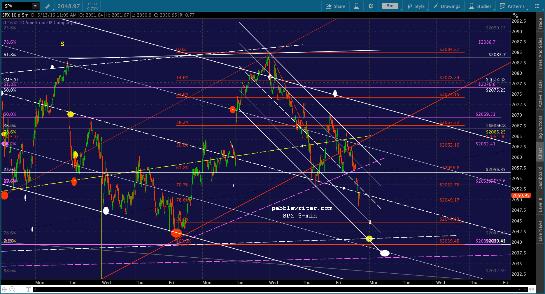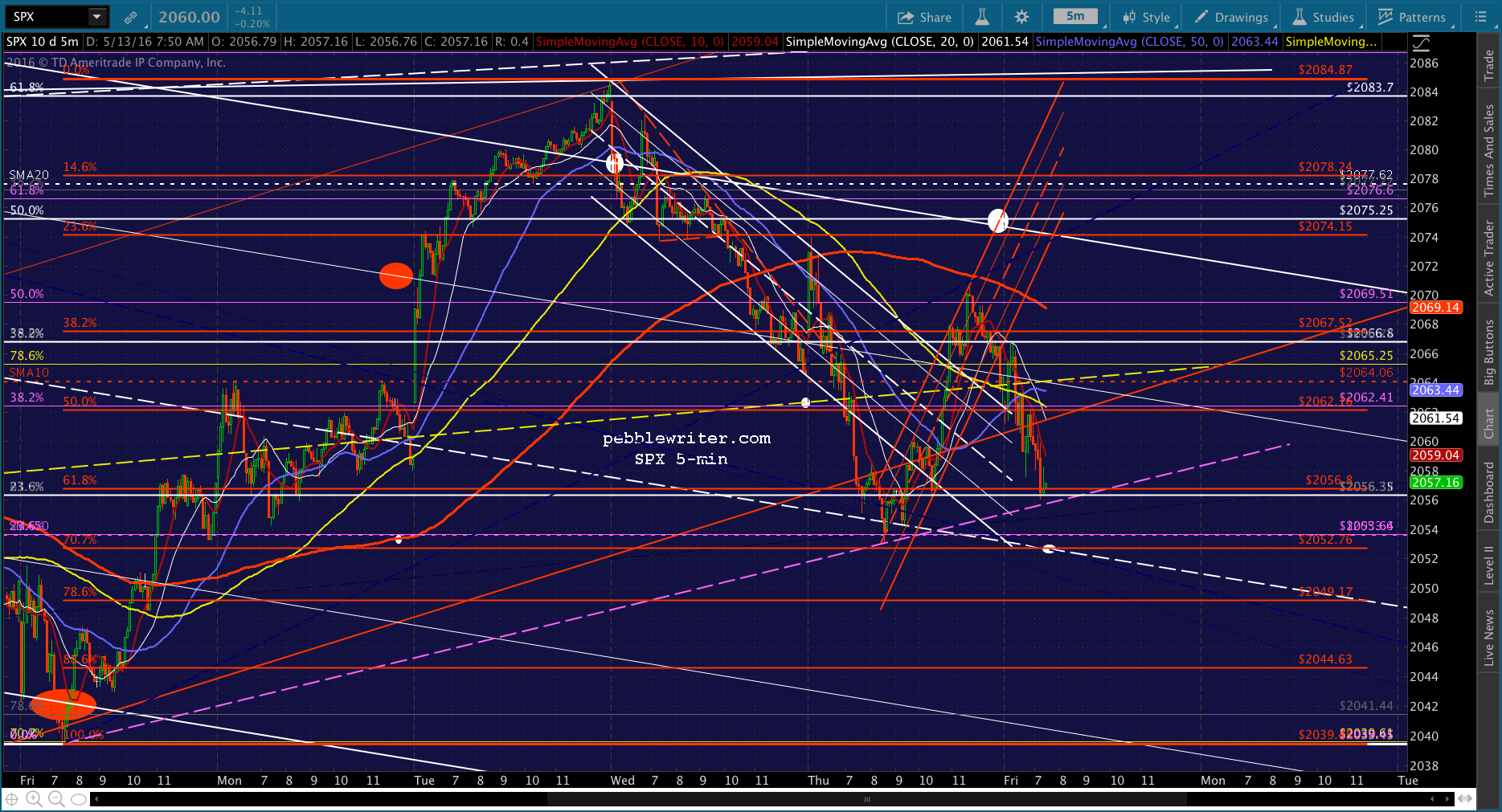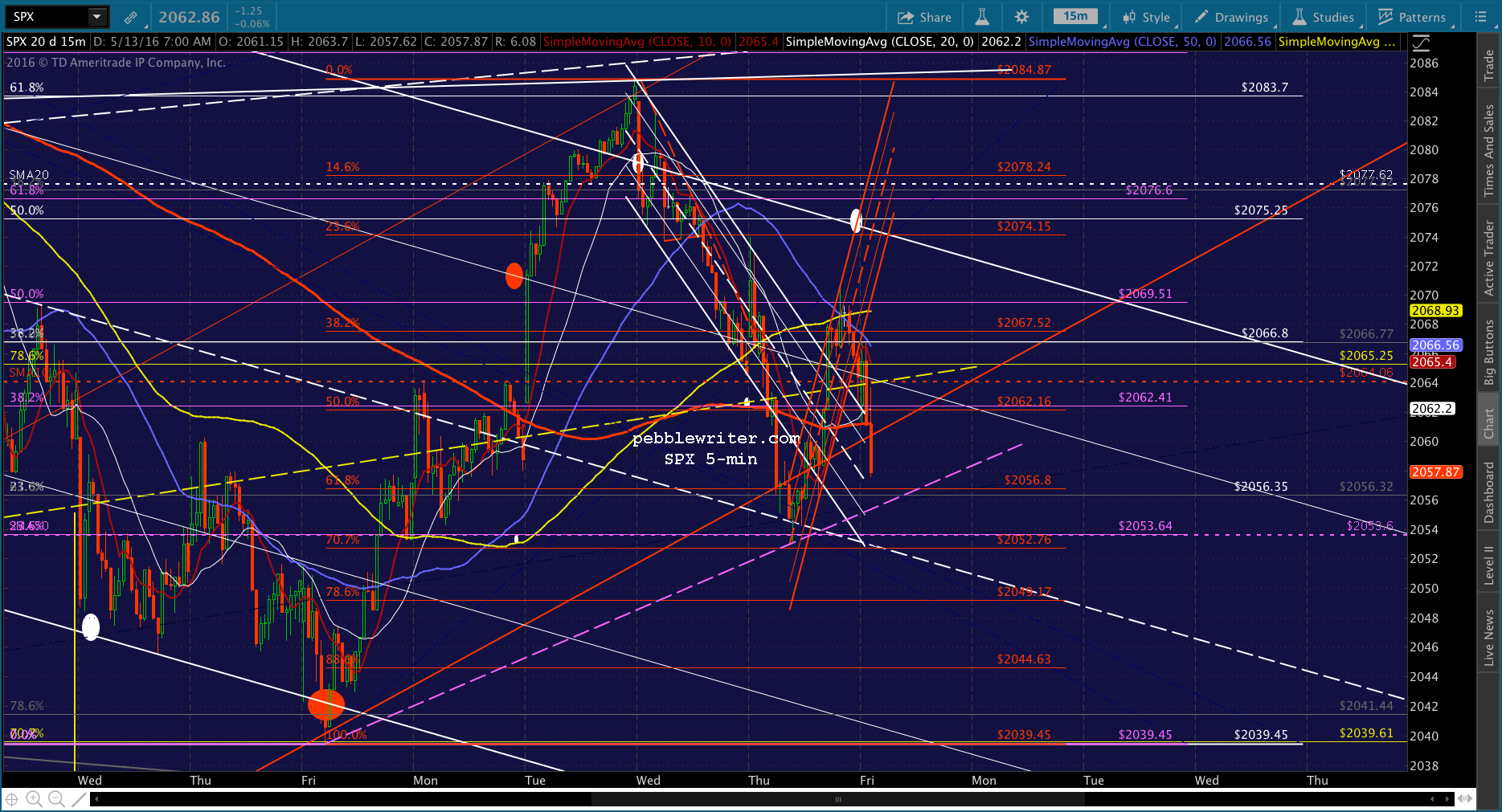 SPX has rallied above the neckline to the SMA5 20 as ES reached the white channel .786 line. With inventories and consumer sentiment coming up at 10AM, I’d stay on the sidelines. This could break either way, with the upside target being the white channel top at 2074 and the downside being the white channel midline at 2052, followed by the .786 at 2049 and .886 at 2044.63.