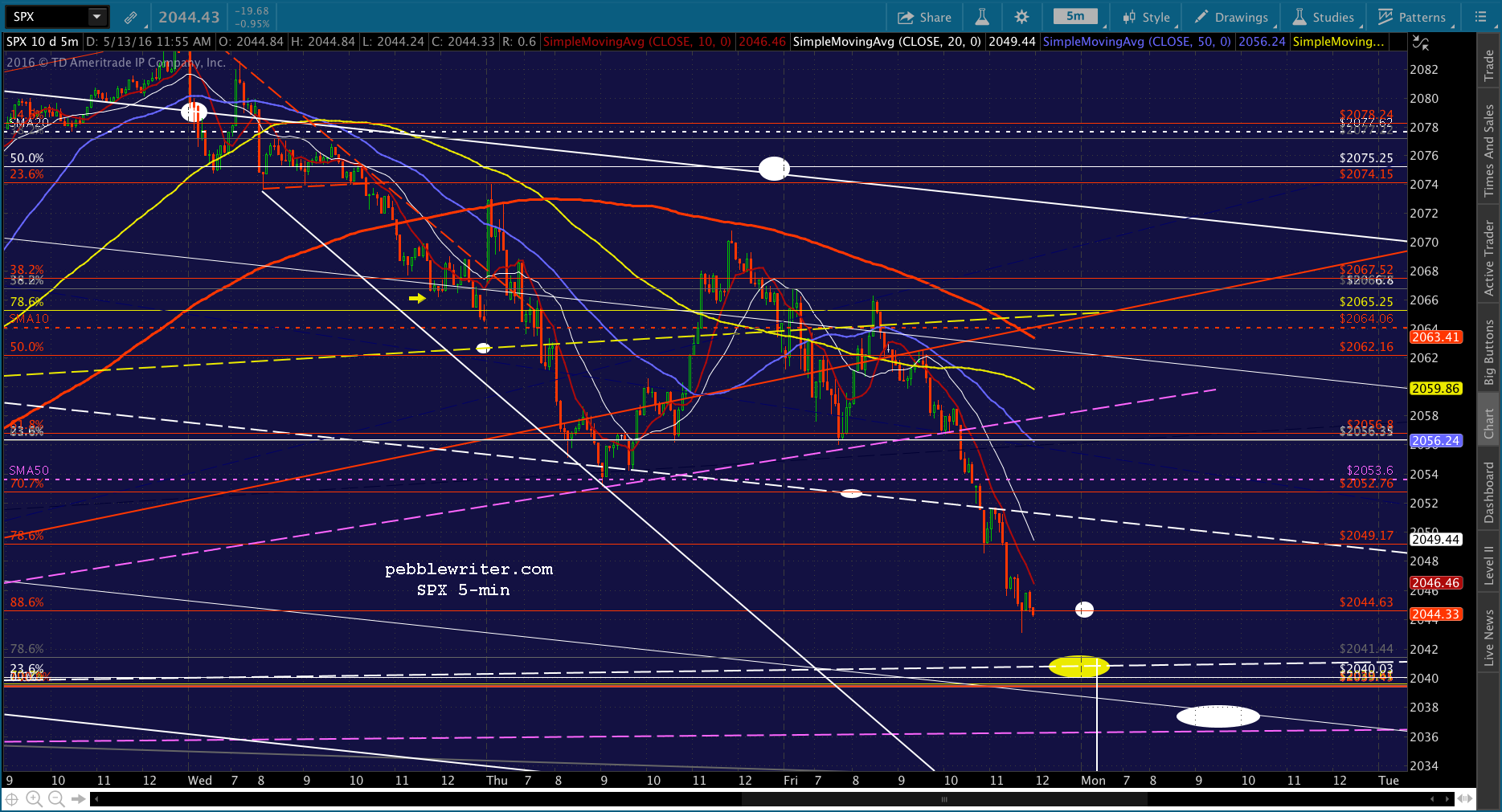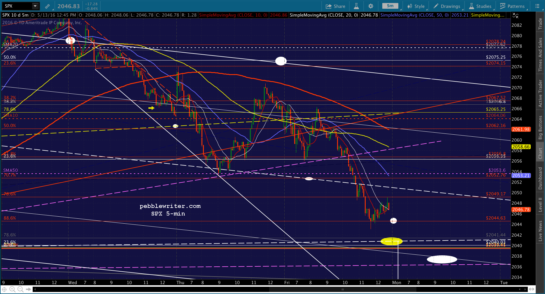 Could SPX drop below the SMA200 at 2012? Perhaps not. But, note that the yellow dot below is at the .236 of the rise from Feb 11, and the white H&S target would be the .500 Fib of that rise. So, in the absence of heavy manipulation (as if…) it makes perfect sense.