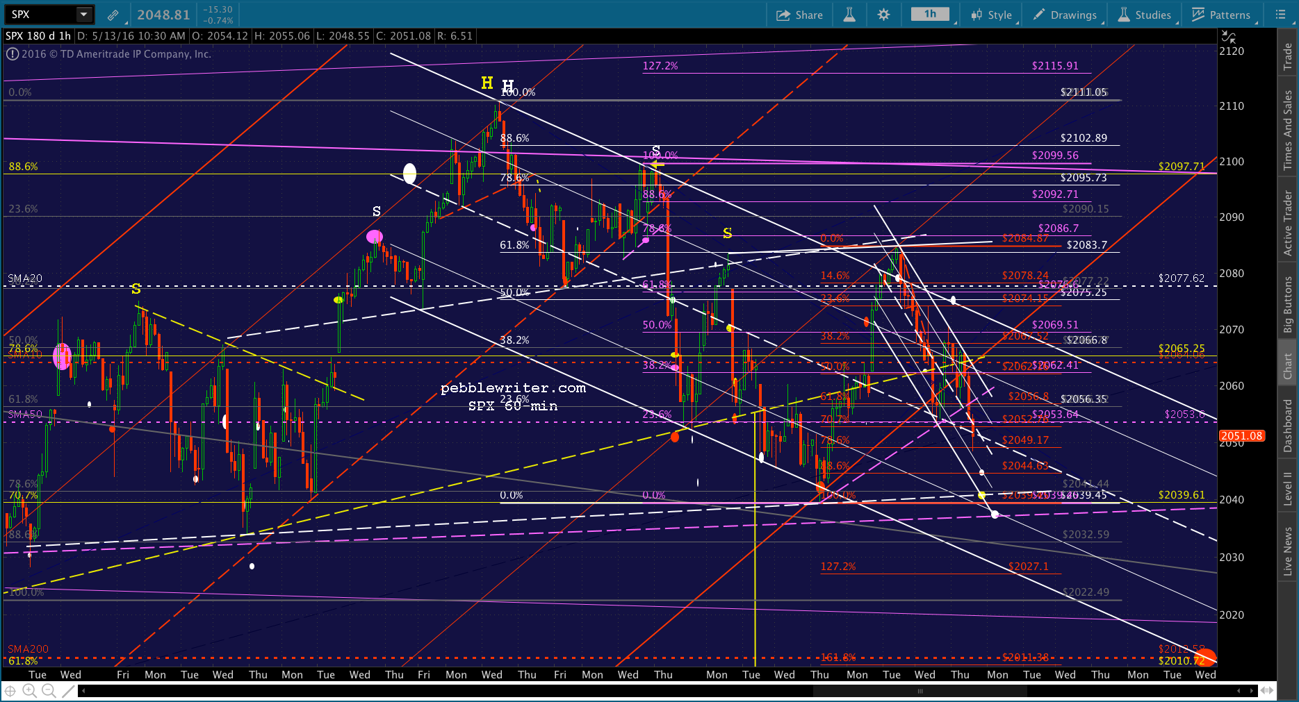 The bigger picture looks to me like we’re going to see the falling white channel’s .236 and, eventually, bottom get tagged — probably at the SMA200 (now 2012.58.) Note however, that another H&S Pattern could potentially complete at the dashed white line around 2041. It would target 1965, which is the 1.618 of the gray grid which rallied from 2022 on Mar 24 to 2111 on Apr 20. Watch out for an interim bounce at the .886 at 2044.63.