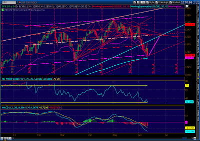 To recap, about a week ago I noticed [Watch for the Rebound] that the drop we were experiencing might set up an upward-trending channel that would embolden the bulls. The channel could be seen by drawing a trendline off the 1344 and 1370 highs, and a parallel bottom between the 1249 low and the to-be-established low.