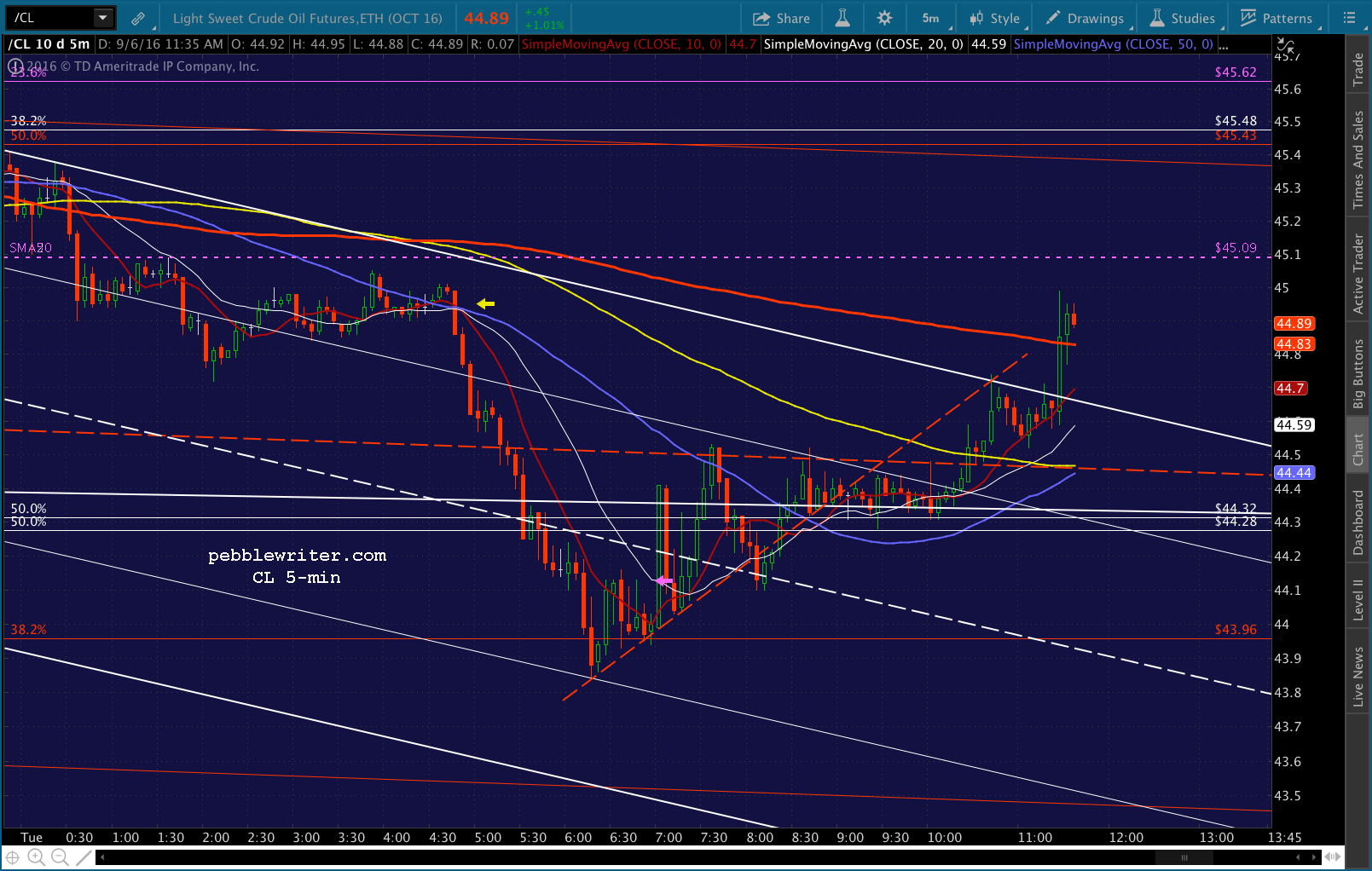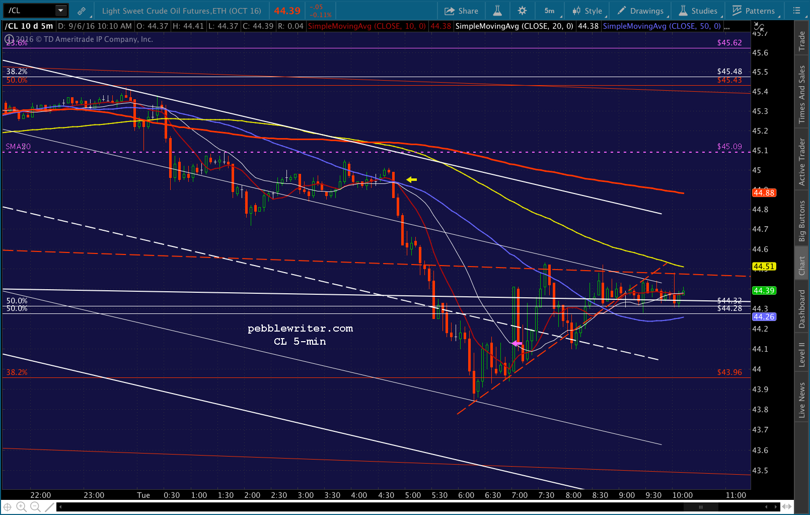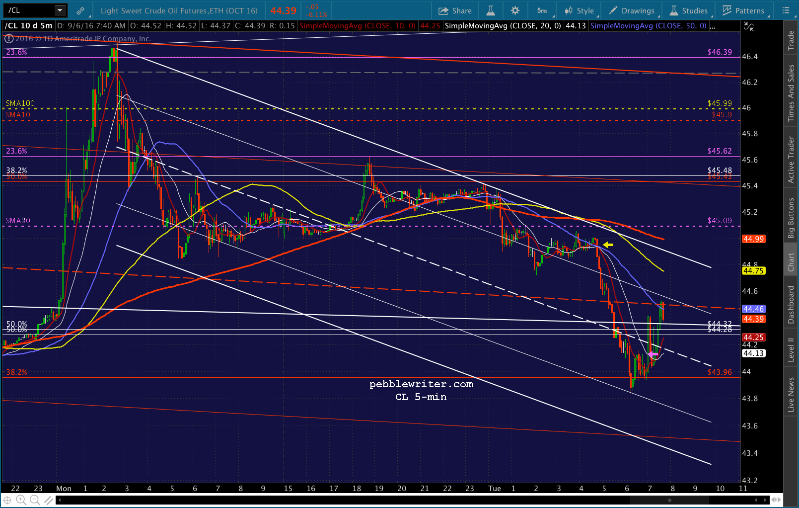 SPX just dropped through its SMA5 20, so we’re short again. Of course, CL decided to pop above its red midline and SMA5 100. Will it be enough? The top of the falling white channel is just above at 44.72ish, with the SMA5 200 at 44.88. I have to step out for a few, but I’d stay short with tight stops. The SMA5 10 should work.