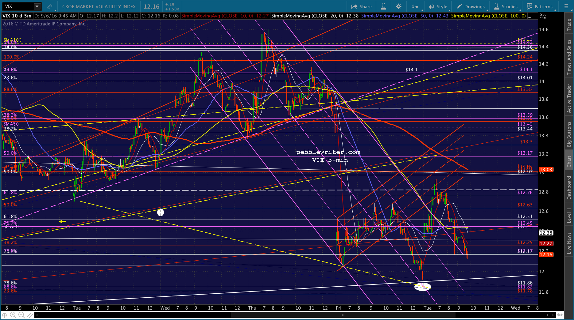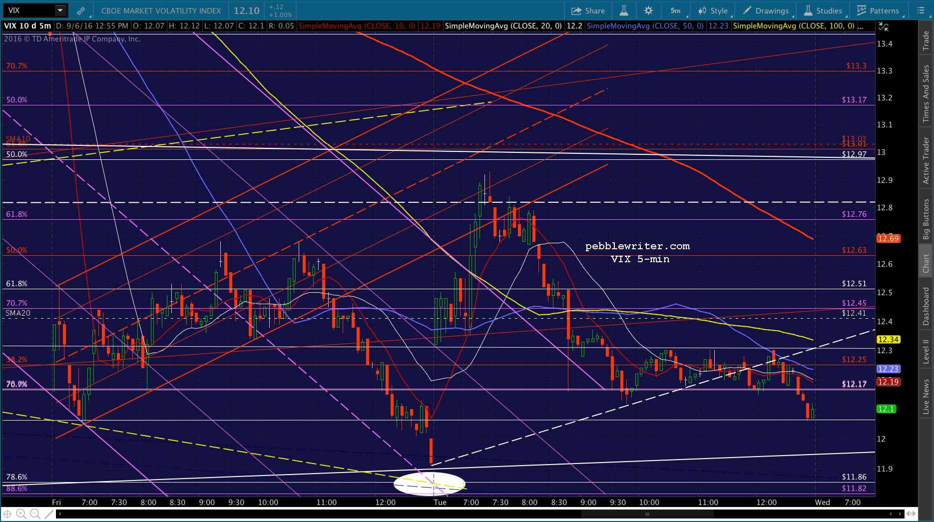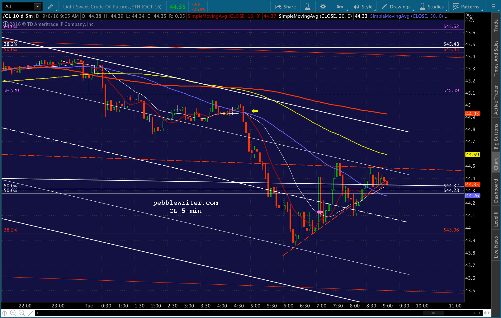 SPX just dropped through its SMA5 20, so we’re short again. Of course, CL decided to pop above its red midline and SMA5 100. Will it be enough? The top of the falling white channel is just above at 44.72ish, with the SMA5 200 at 44.88. I have to step out for a few, but I’d stay short with tight stops. The SMA5 10 should work.