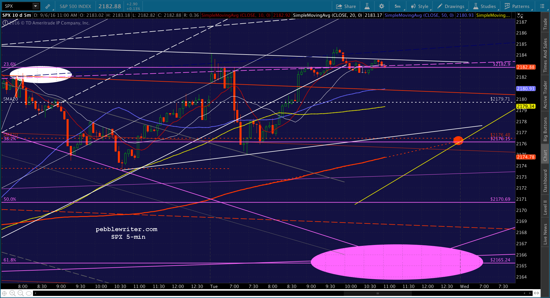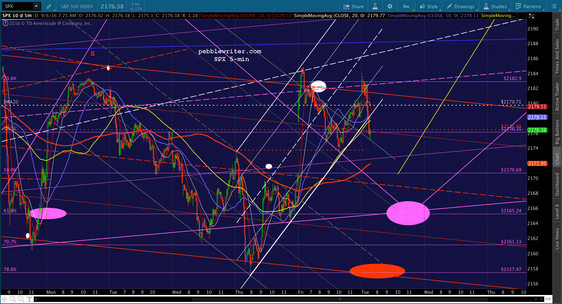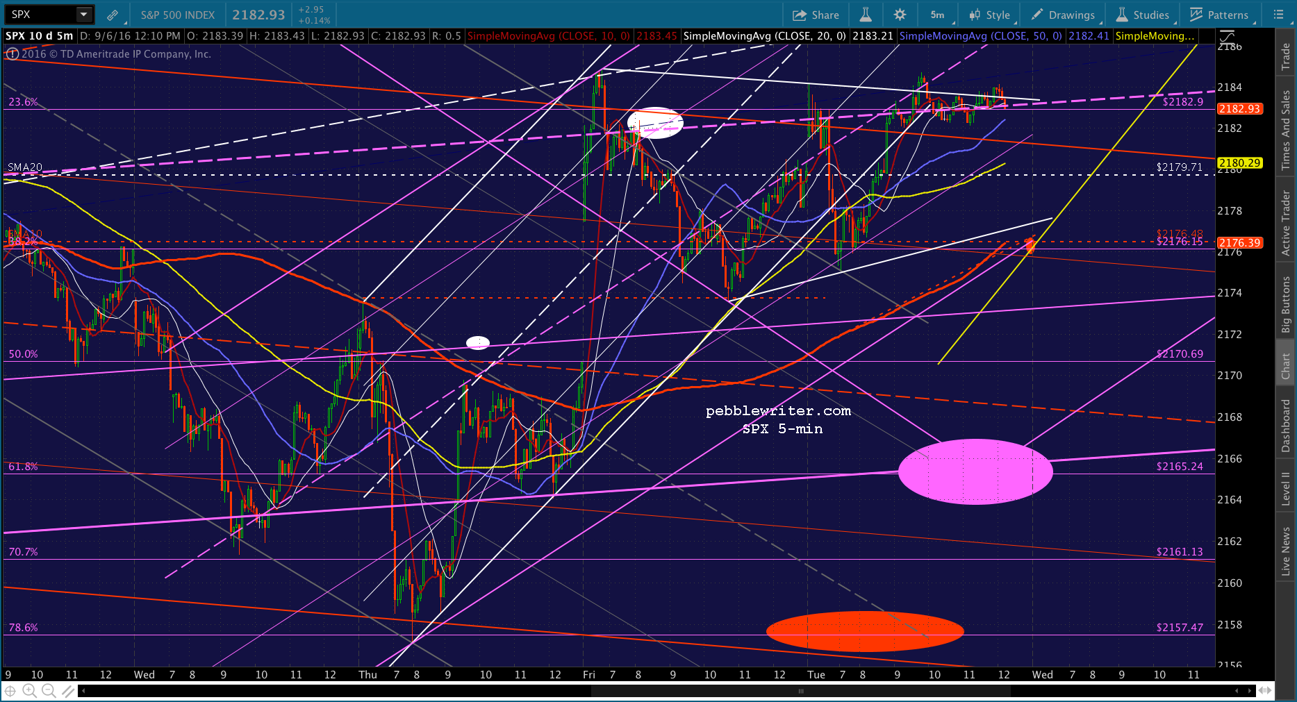 I’m back, and see that SPX popped back up through the SMA5 10 on CL strength. Looks like they’re just stretching this out. I’m wondering whether today’s target should be the SMA5 200 at or near the close — perhaps 2176. It would be about a 6-pt drop from current prices. Note that a drop to 2138 by Sep 12 would entail about 6-pts per day on average.