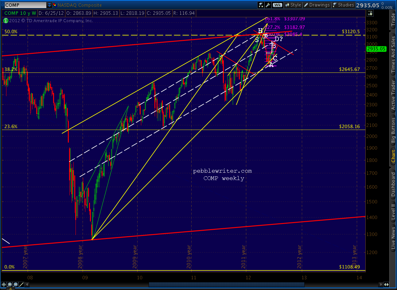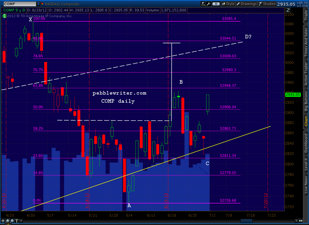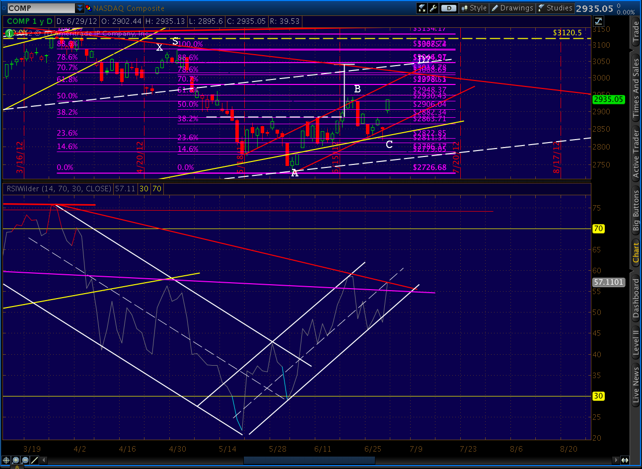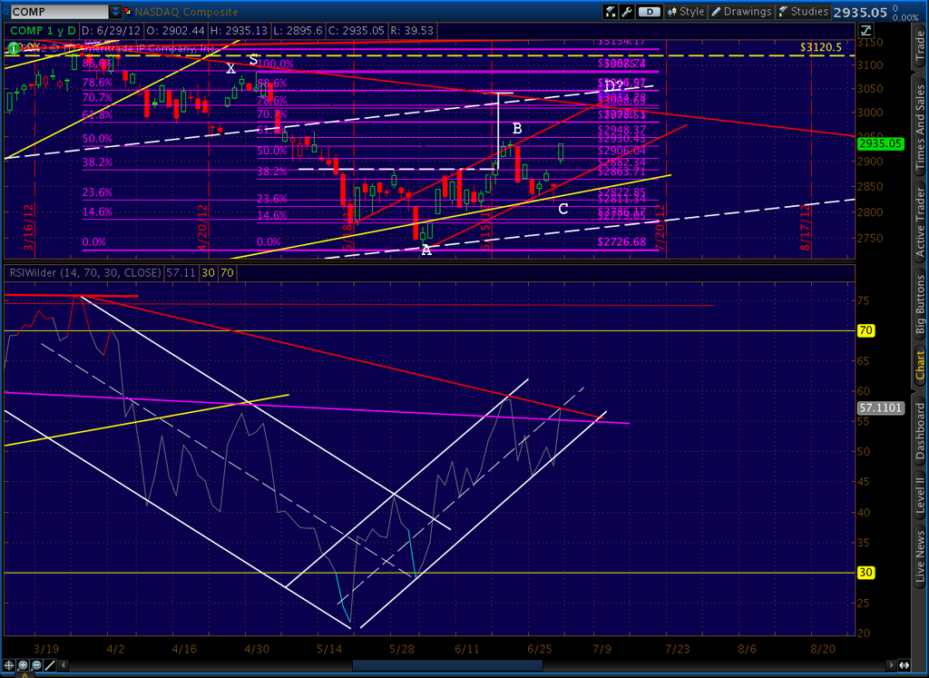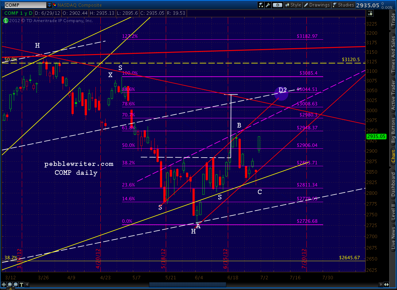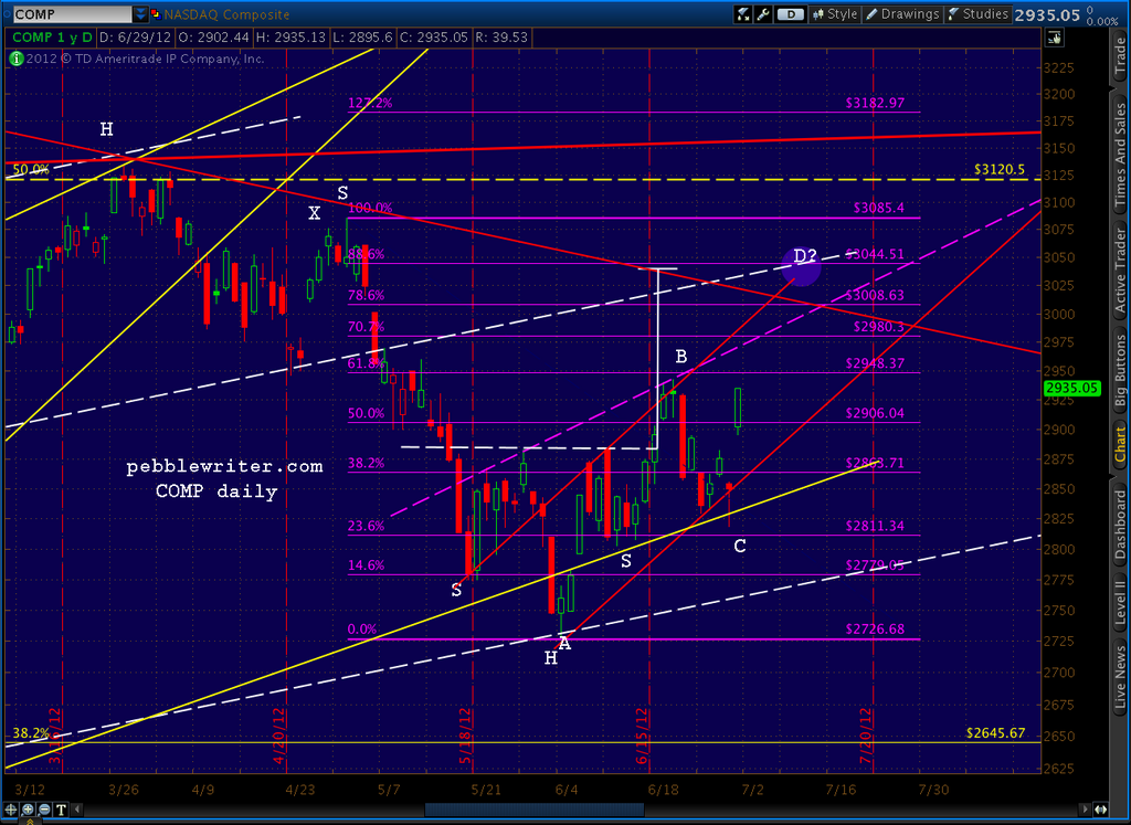 In a close up, the middle channel line can be seen in a three way intersection with the target of the recently completed Inverse H&S pattern and the .886 of the drop from 3085 to 2726. right around July 9 (this .886, BTW, is also the .786 of the drop from 3134 to 2726, so either retracement is viable.)