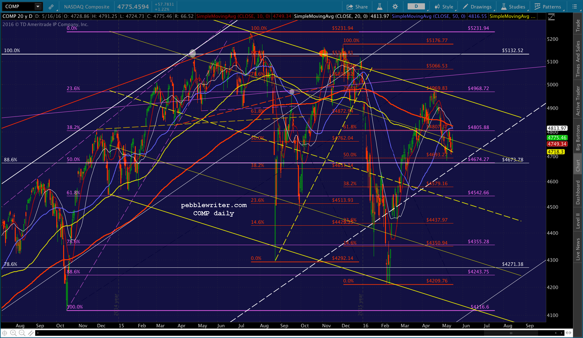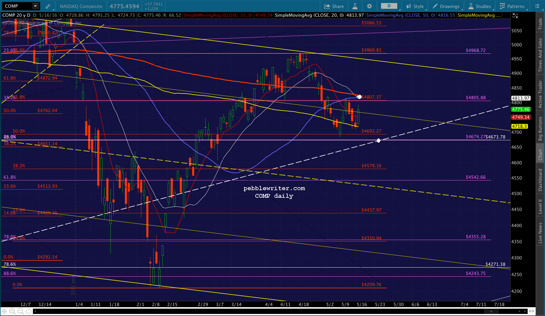 If [COMP] can’t make the leap, then there’s plenty of downside ahead: the red .618 at 4872, the white channel midline at 4500, etc. But, that’s not the way it’s shaping up.