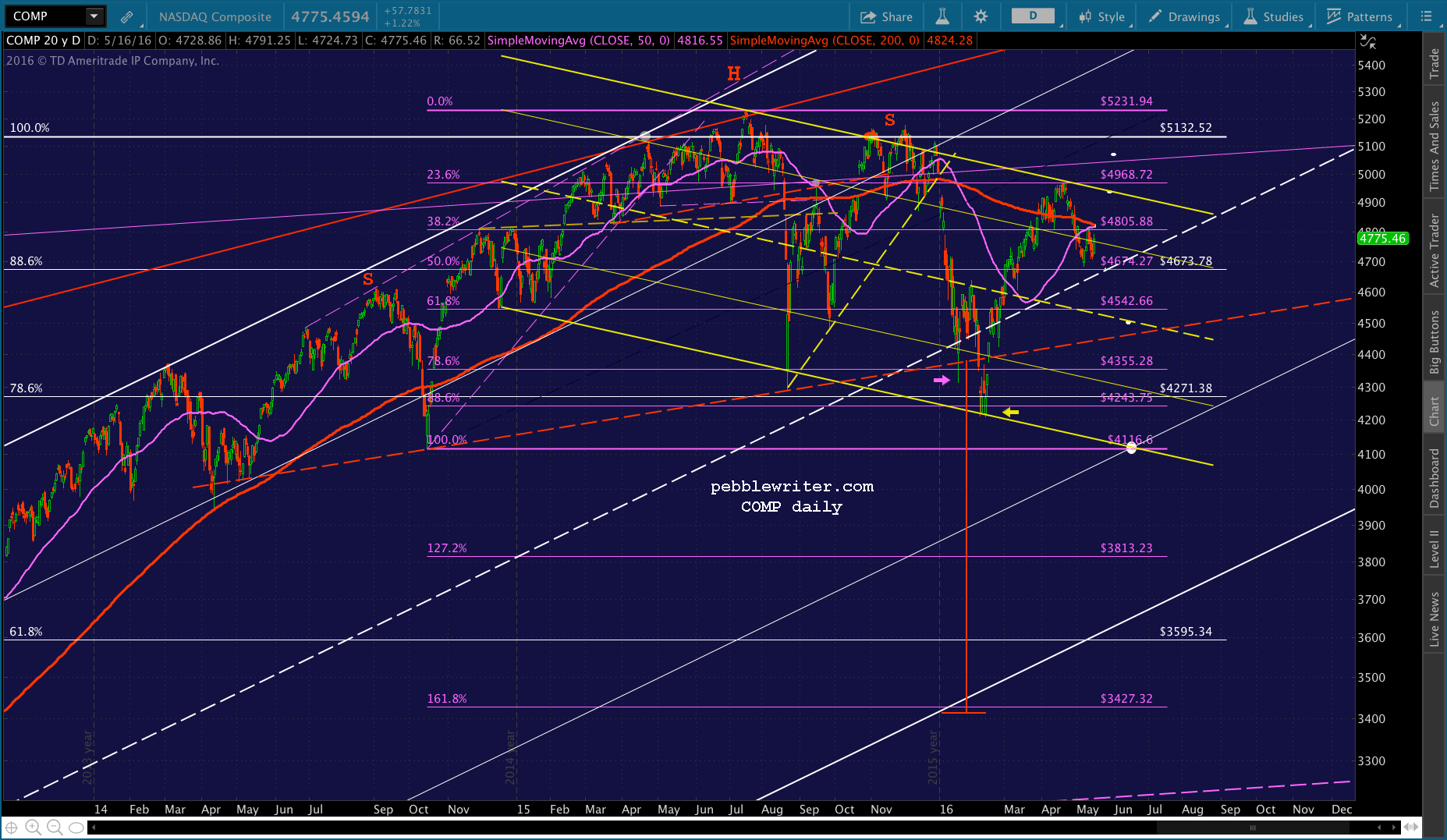 If, on the other hand, COMP breaks down below the white channel midline at 4673, the next support is the yellow midline around 4500, ideally in mid-June, followed by the red neckline at 4440-4480 and the previous low and white channel .236 line at 4116.