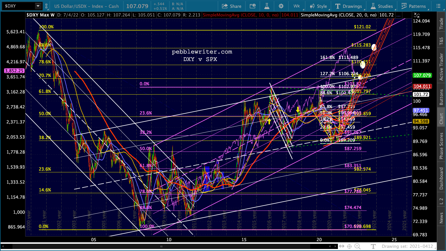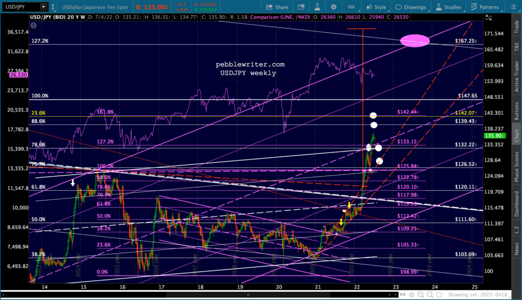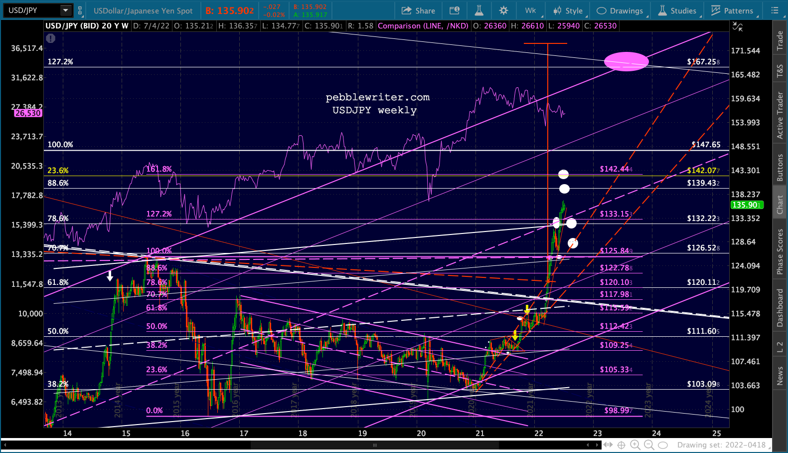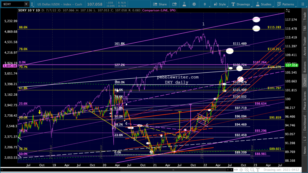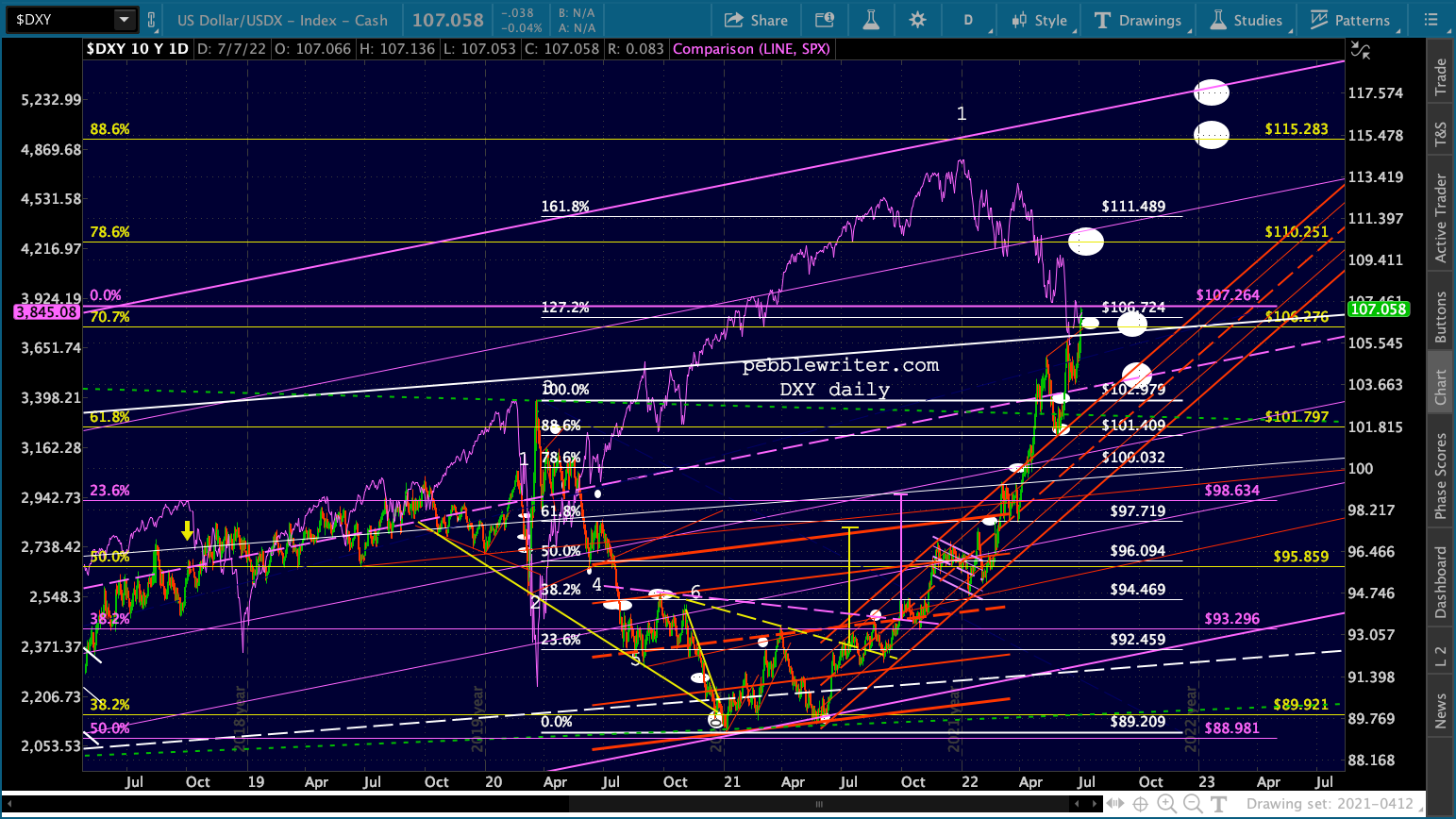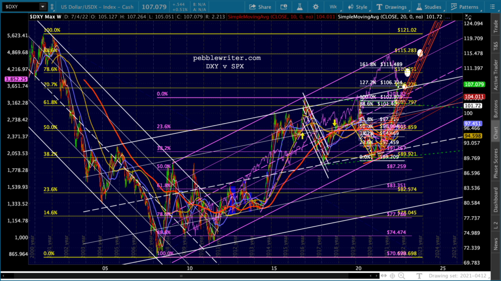 The yellow .707 at 106.276 and white 1.272 at 106.741 both intersect the white channel top in late 2022 – but it seems unlikely that DXY would wait that long to make its move given the fluidity of the Ukraine invasion.