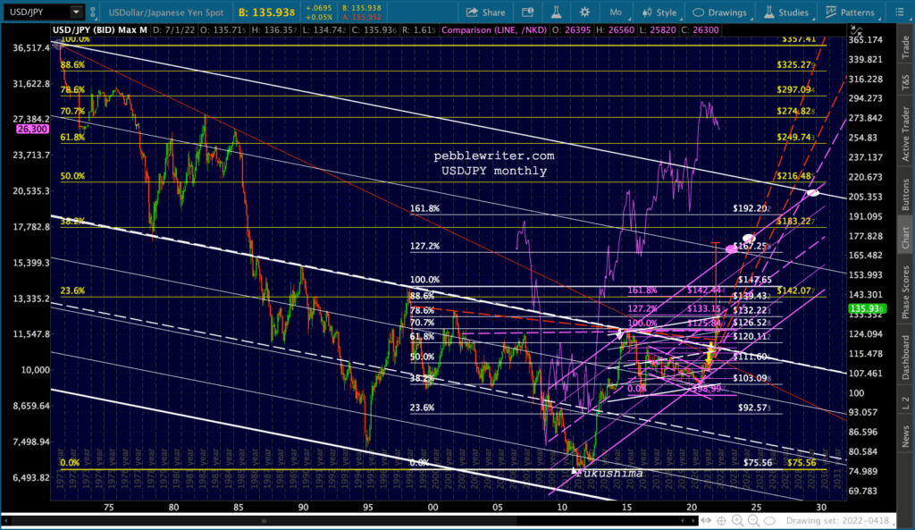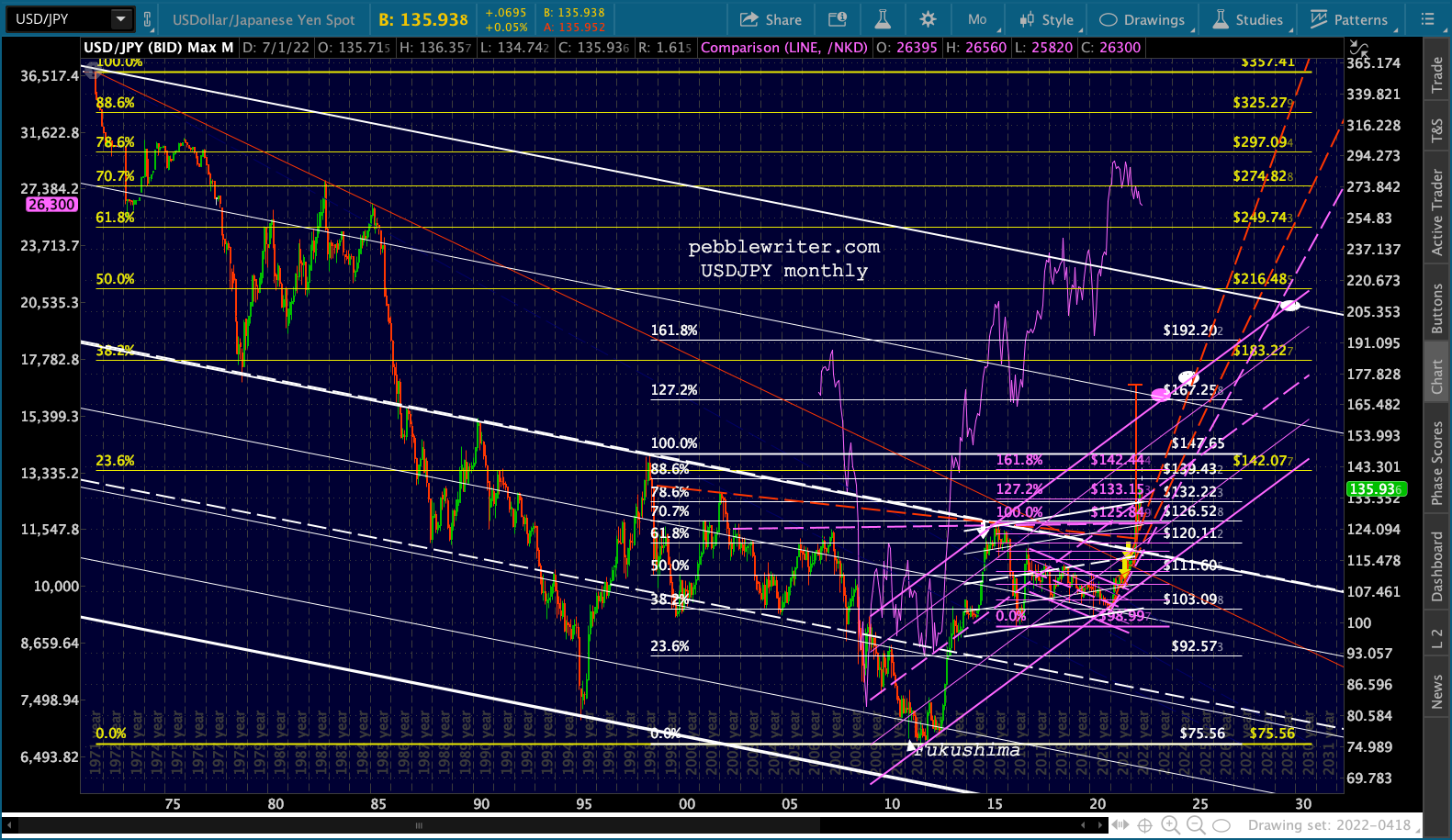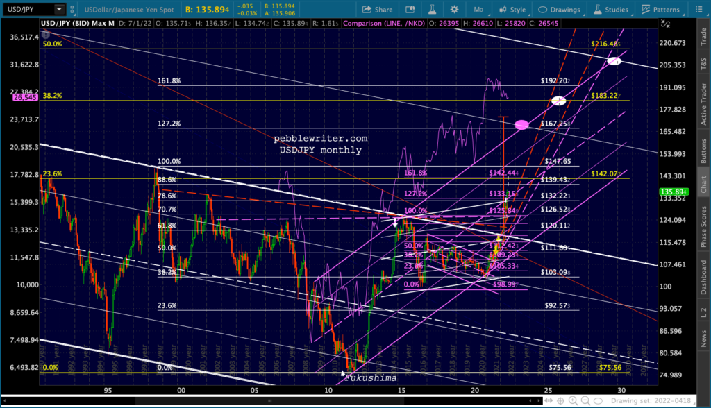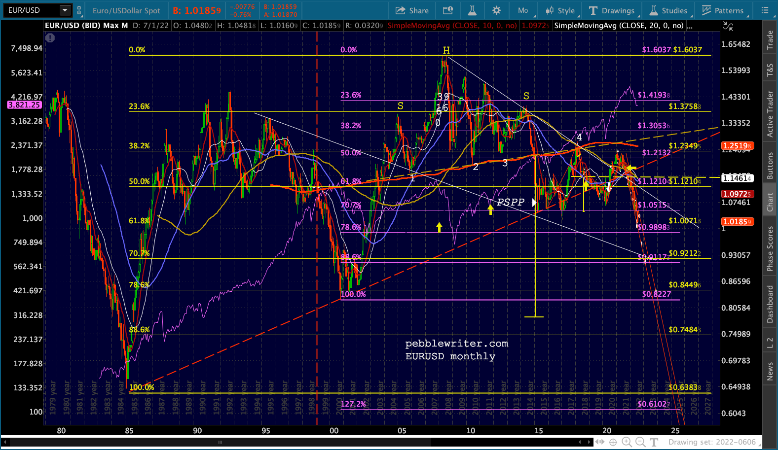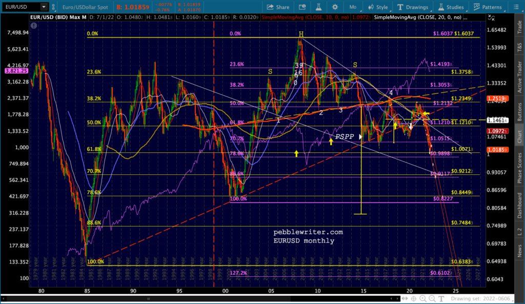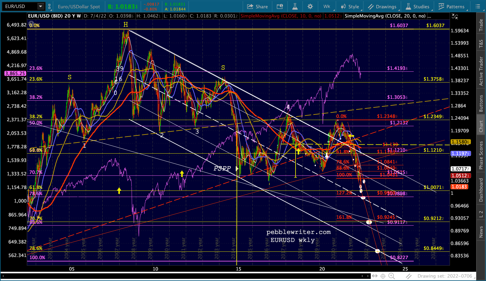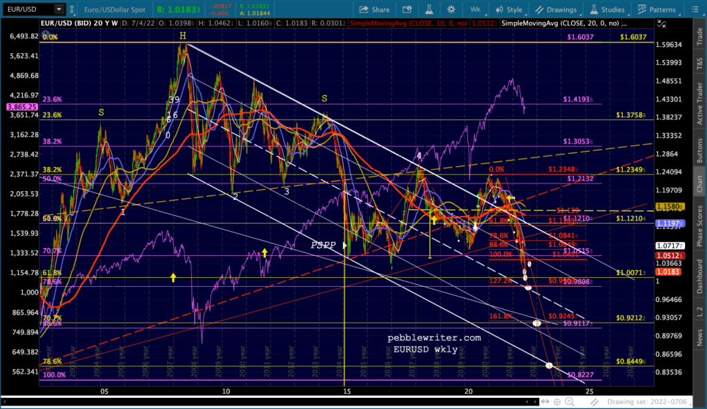 In the absence of a Russian withdrawal from Ukraine, which hardly seems likely at this point, we shouldn’t be surprised if EURUSD plunges right through the .618 this time – especially between now and July 19 when stocks are expected to bottom at -30%.
