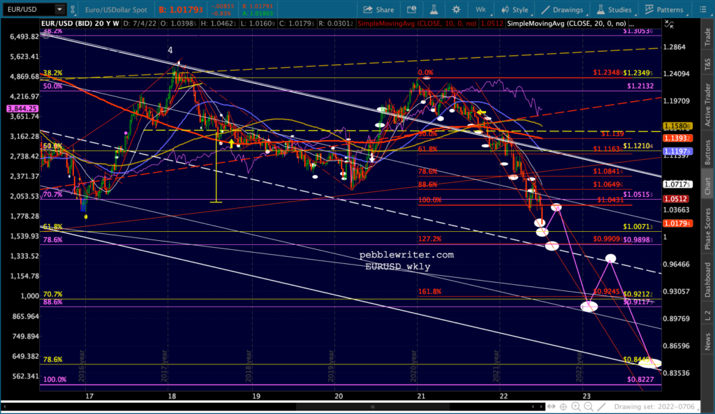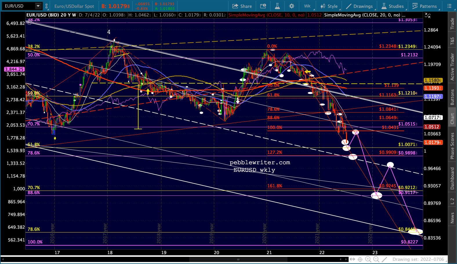 Taking our analog into account, the most likely path is a bounce at 1.0071 or .9898 between now and July 19, a strong backtest bounce into September, then an even bigger dump into January 2023. If we get a bounce at 1.0071, then maybe something like this.