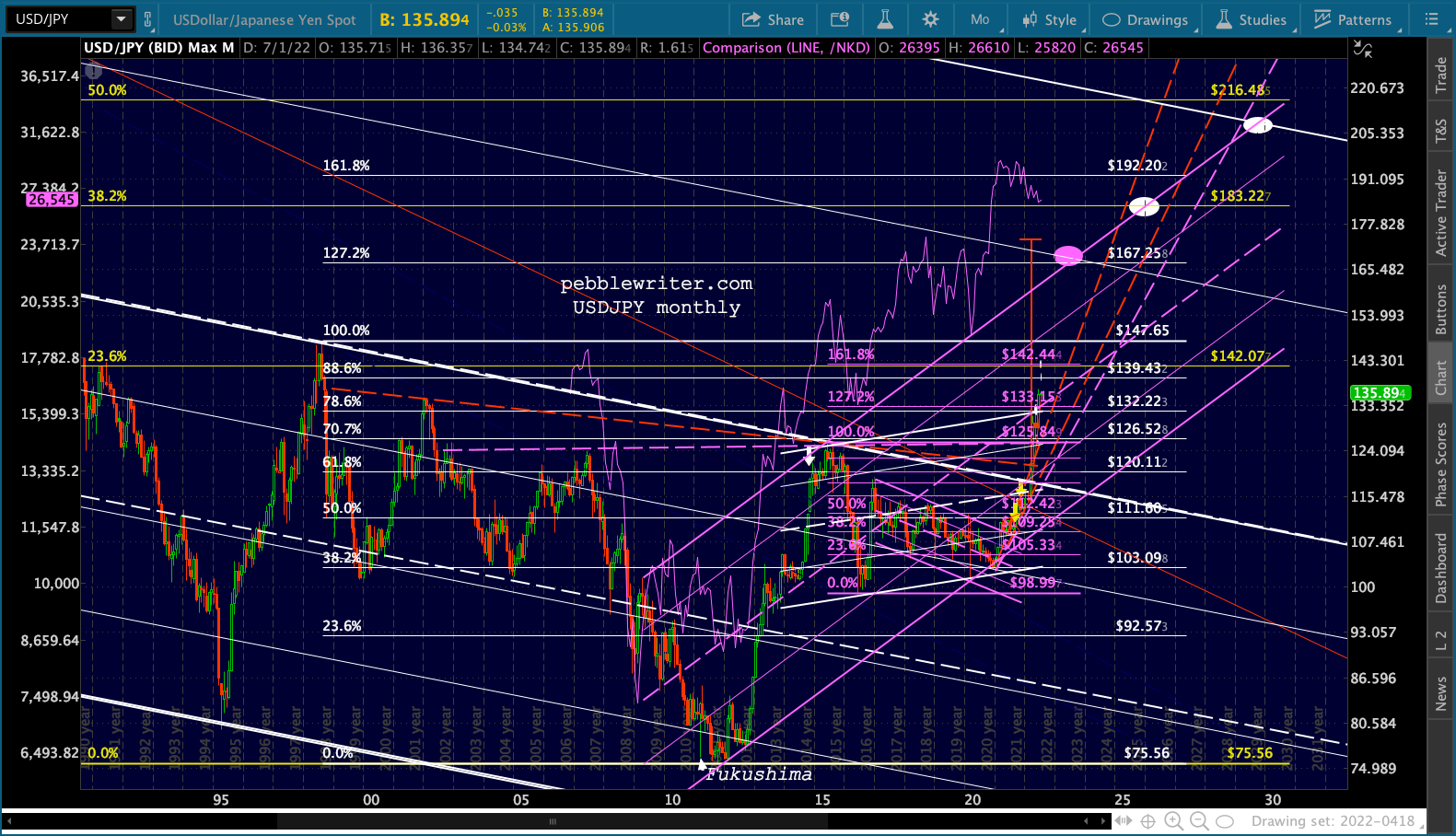 Let’s see if USDJPY sheds any light. In past charts, we’ve focused on the falling white channel, the rising purple channel, and the Fib levels.