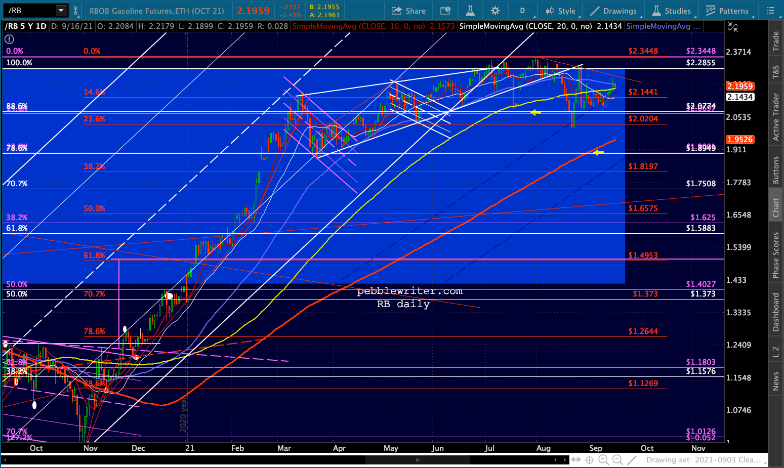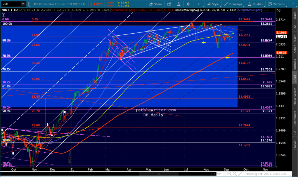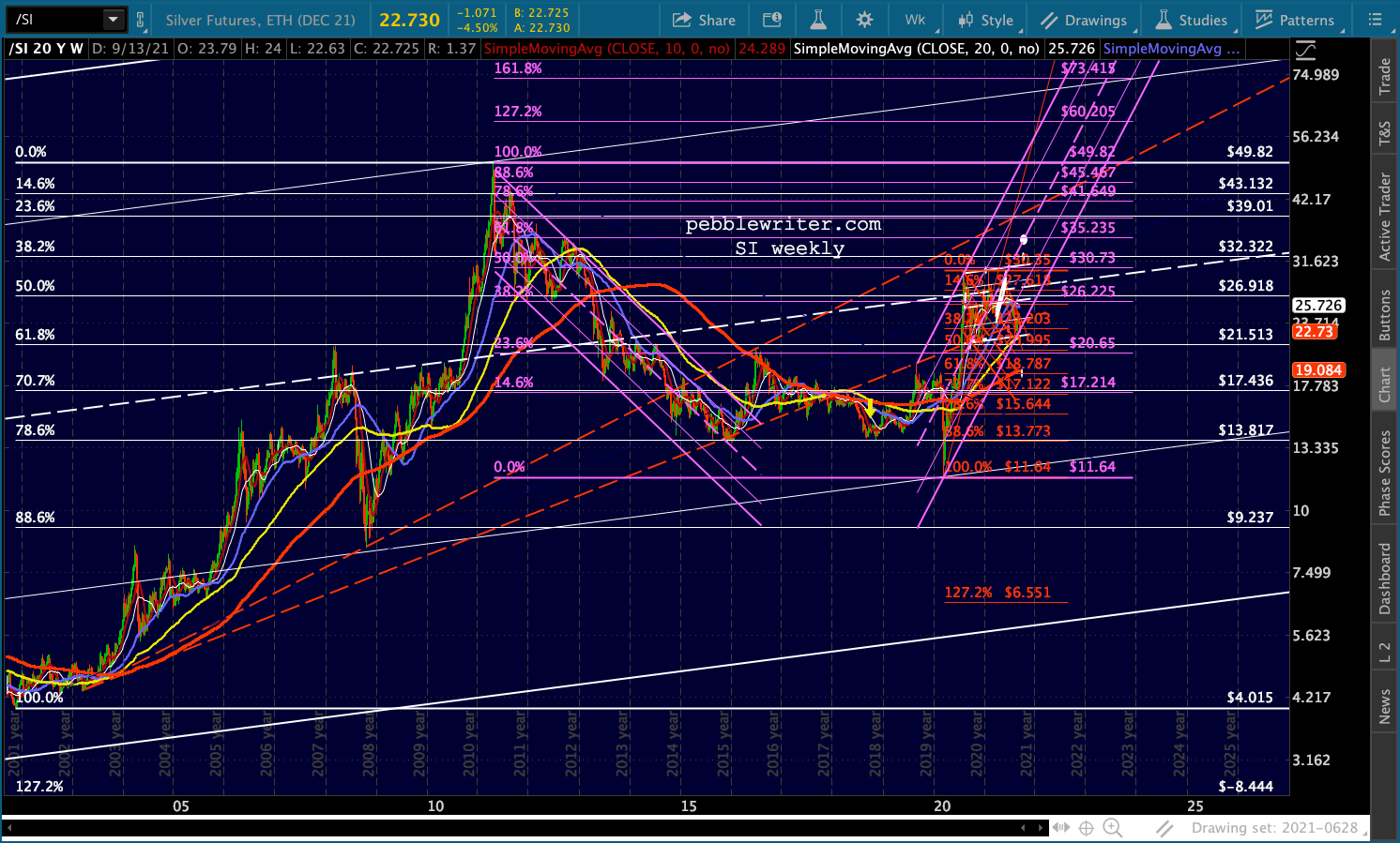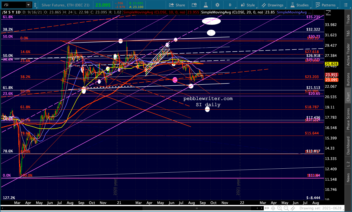 Note that losing this support would also mean losing the lower dashed red TL. The nearest reasonable support below 22.40 would be20 (round number), followed by the red .618 at 18.79.
