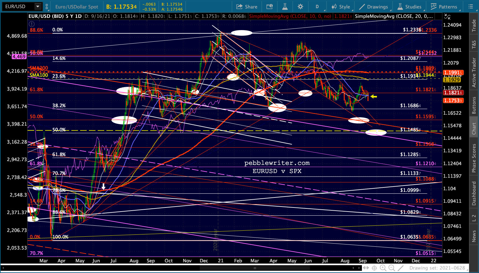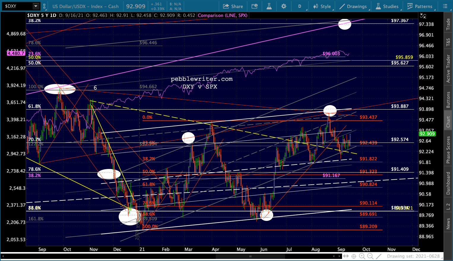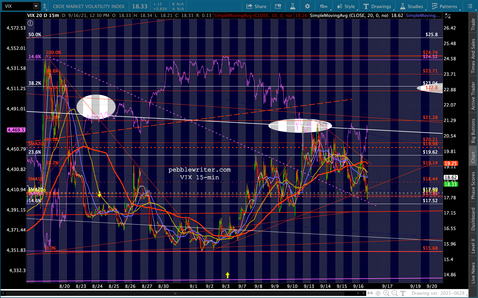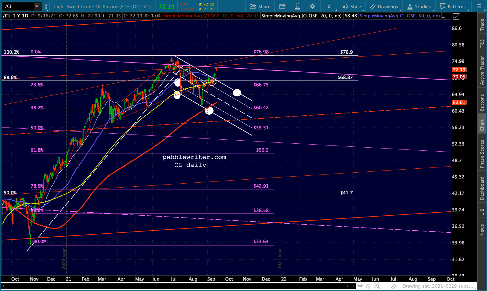 Note that losing this support would also mean losing the lower dashed red TL. The nearest reasonable support below 22.40 would be20 (round number), followed by the red .618 at 18.79.