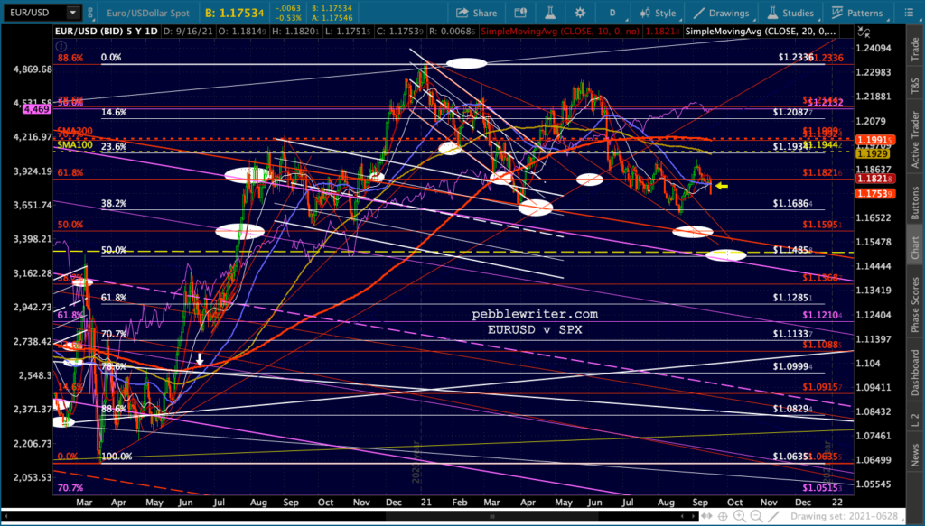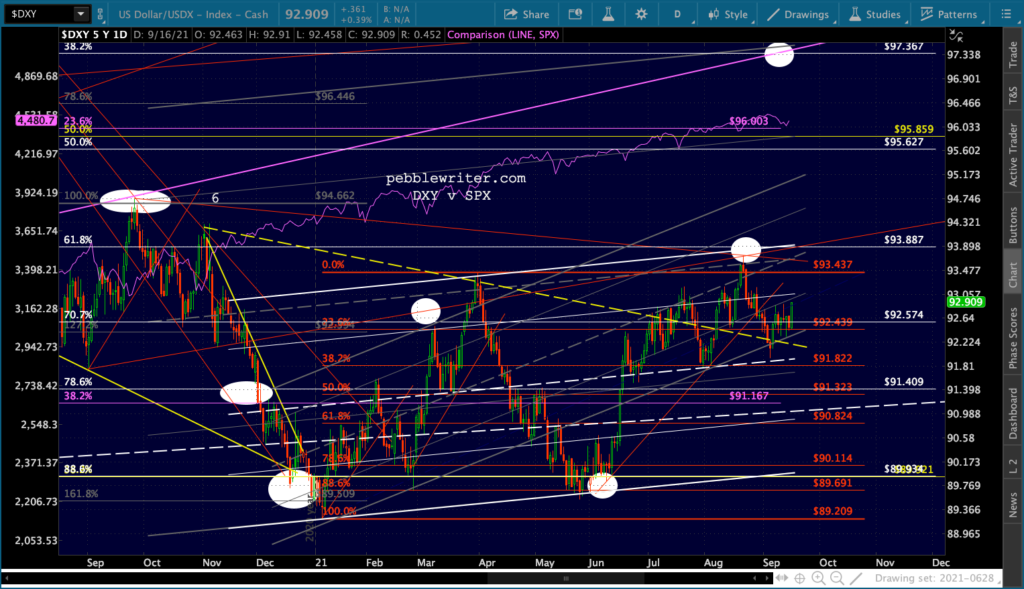 This is sending DXY higher, of course – preserving the dashed yellow TL and potentially setting up a test of the white flag pattern top. The EURUSD and DXY moves are clearly bearish for stocks.