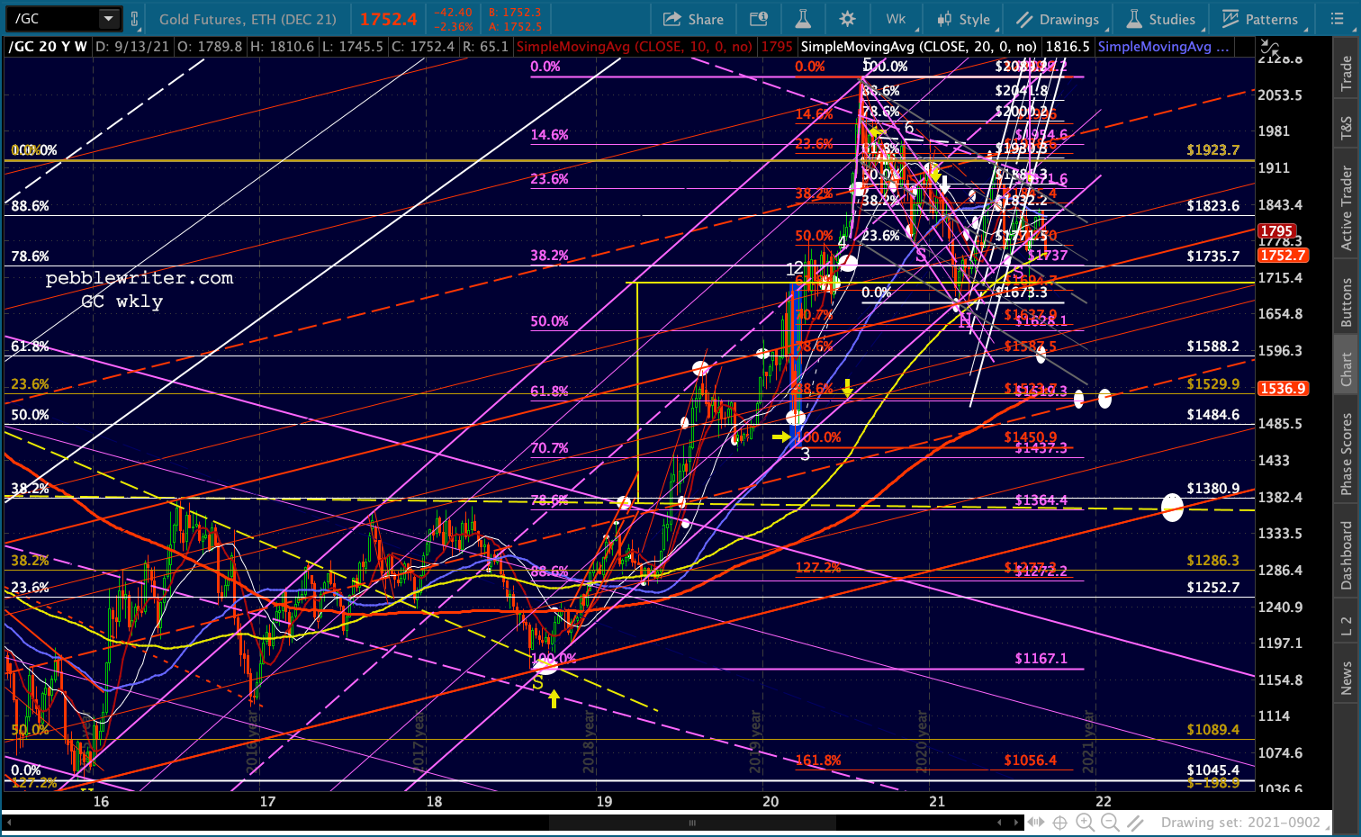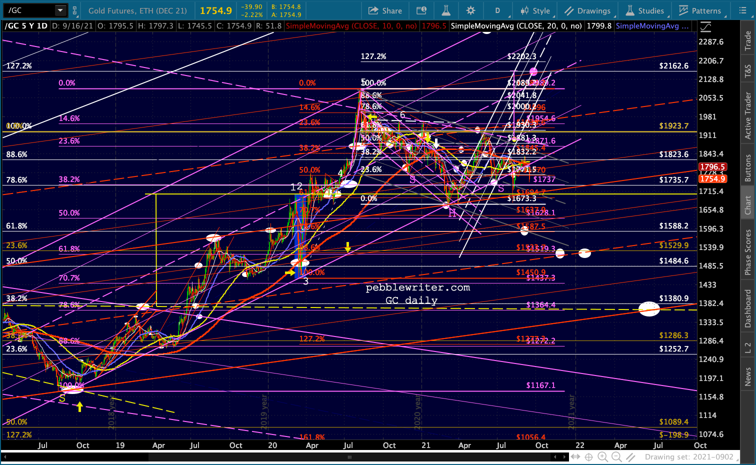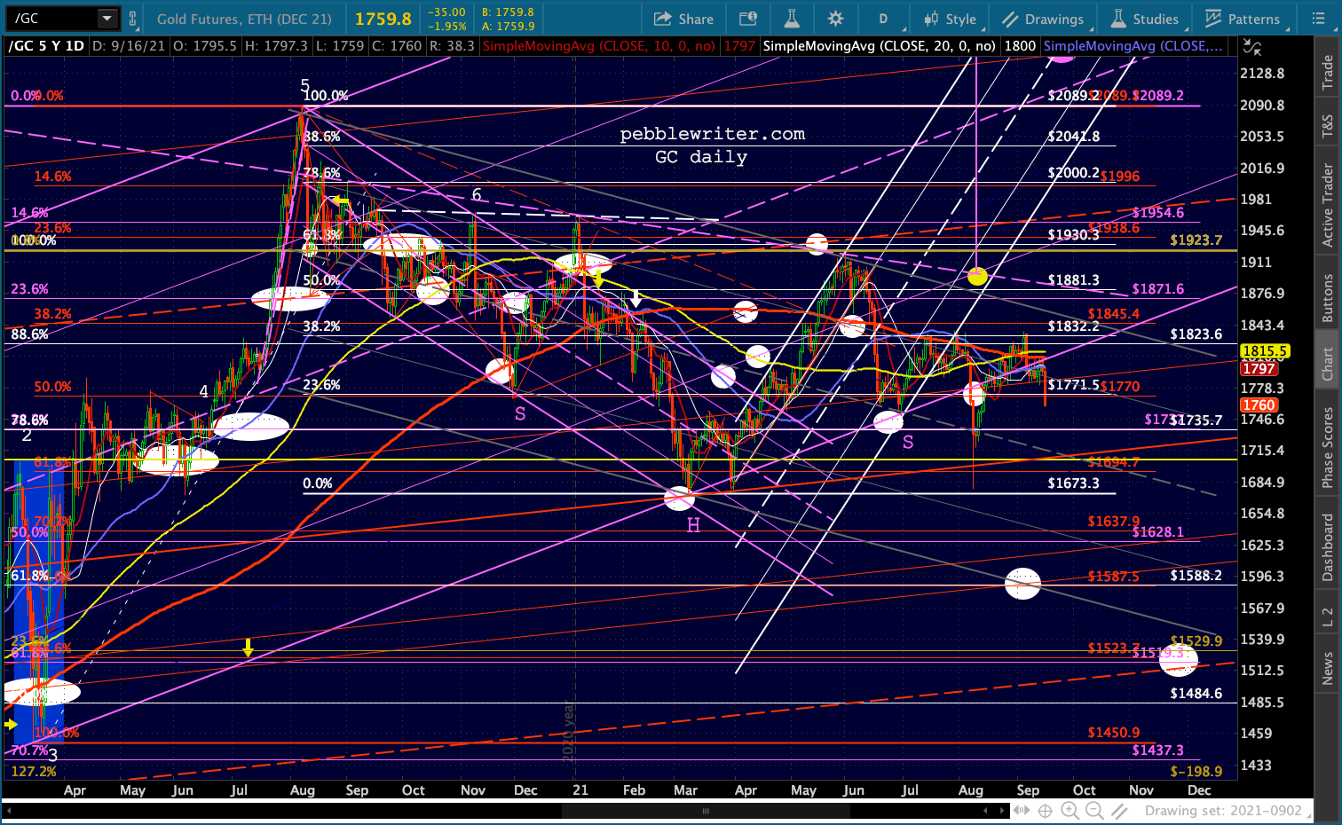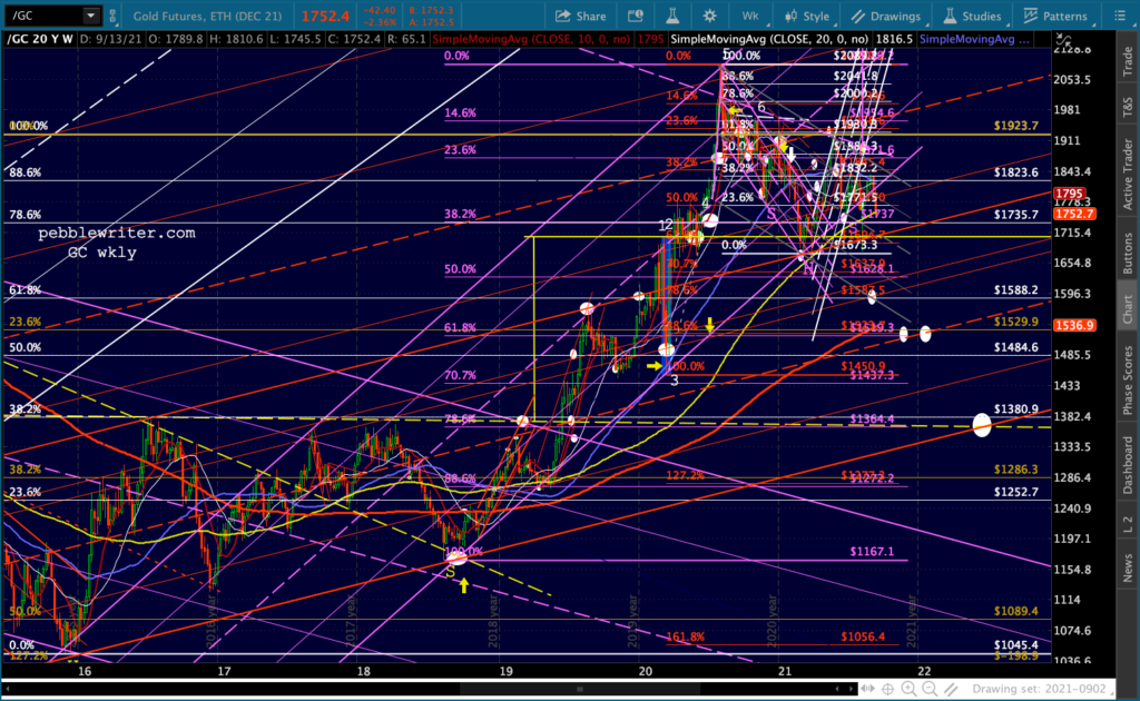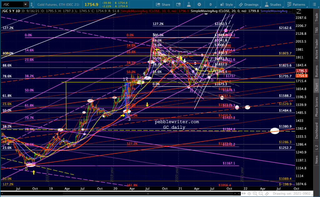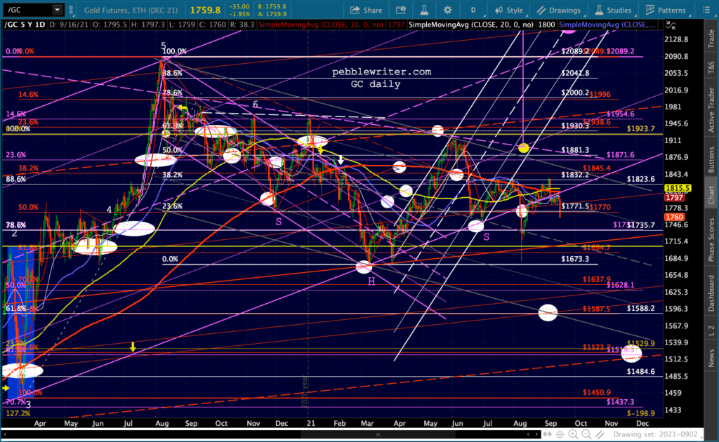 Gold and silver have each fallen below their purple channel bottoms again. For GC, this threatens a trend going back to Aug 2018.