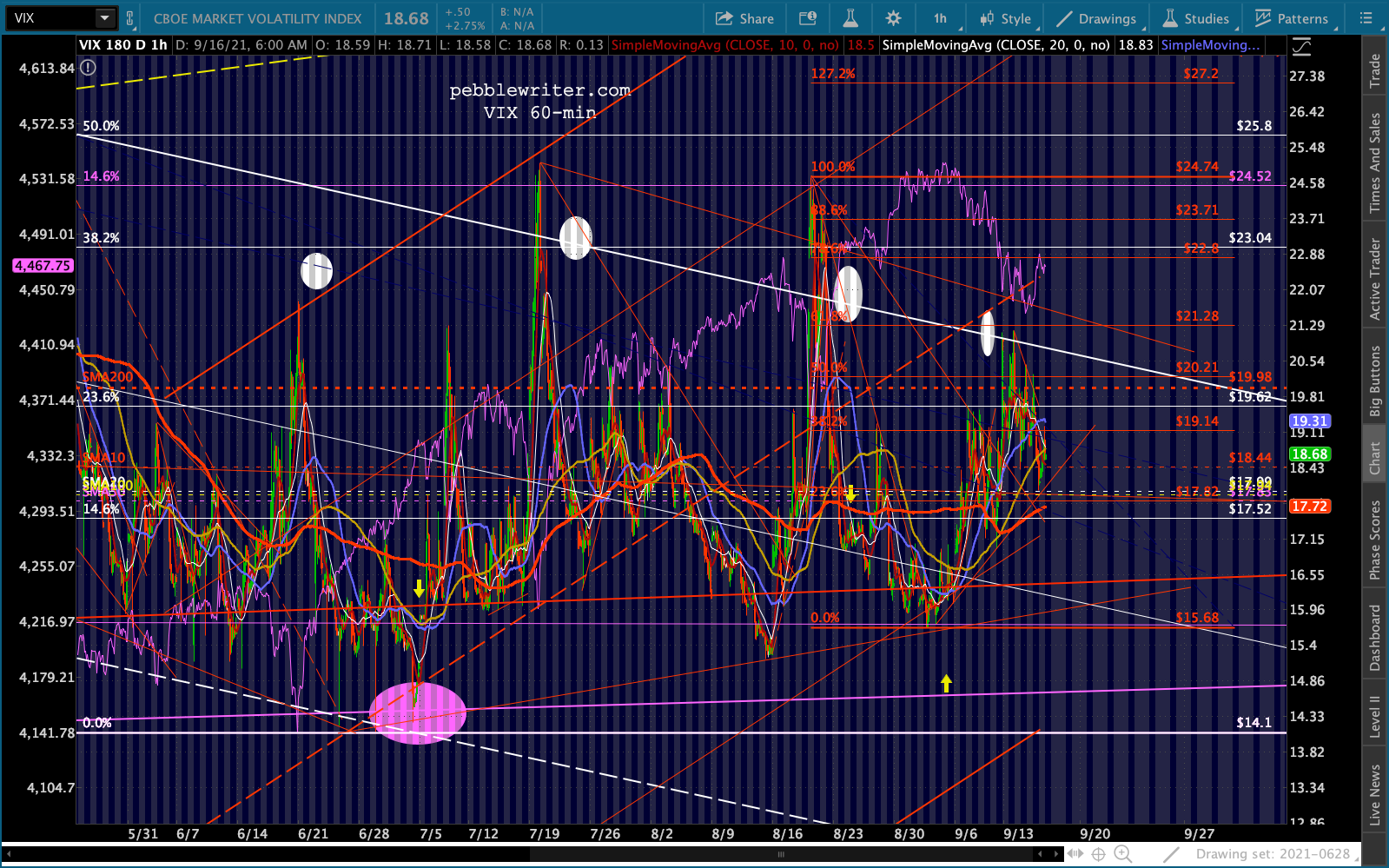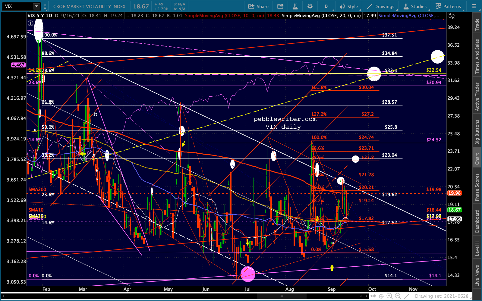 Although VIX broke down below the rising red TL and SMA10, it’s back above both now. And, it was very careful not to drop through the falling purple TL of support – a ray of hope for bears.