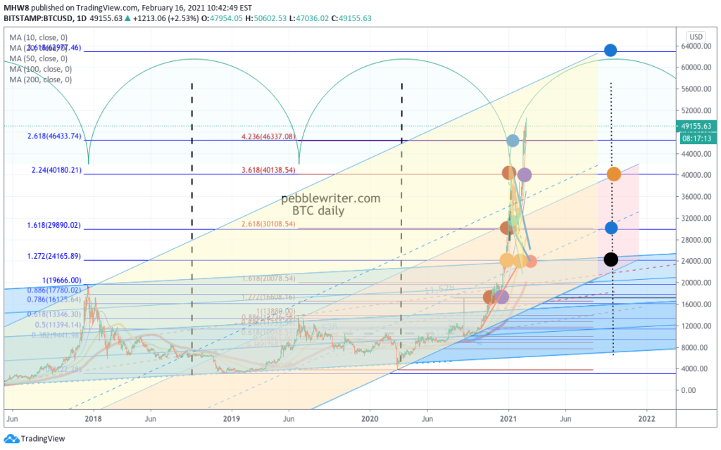 BTC is still leaking higher, with its SMA10 finally catching up with it. It tested 50,000 earlier, a nice big round number that might induce some longer-term holders to liquidate though it has no Fib or chart pattern significance.
