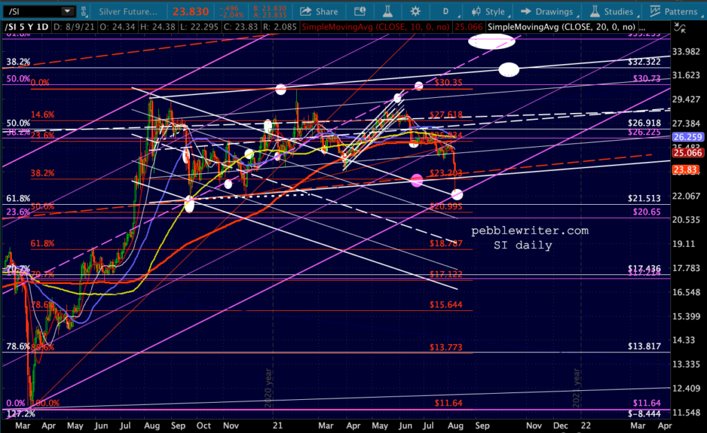 Silver, on the other hand, has fallen exactly to our downside target at pattern support.