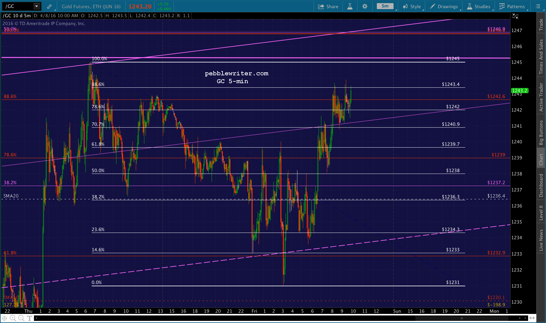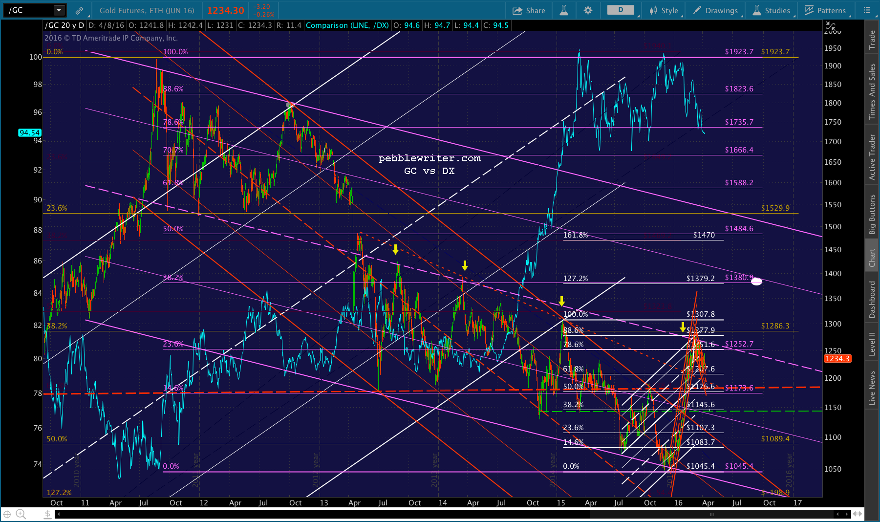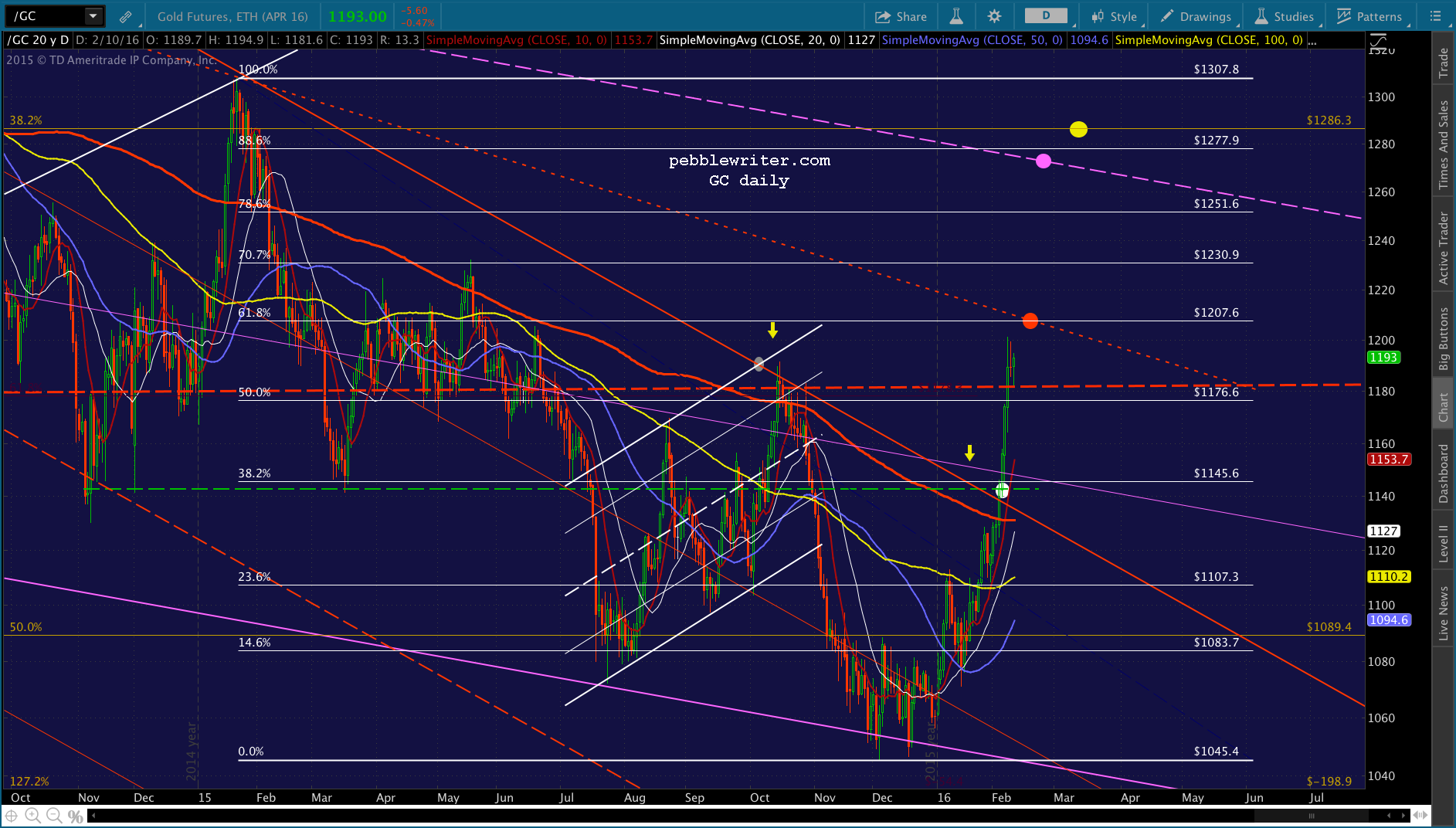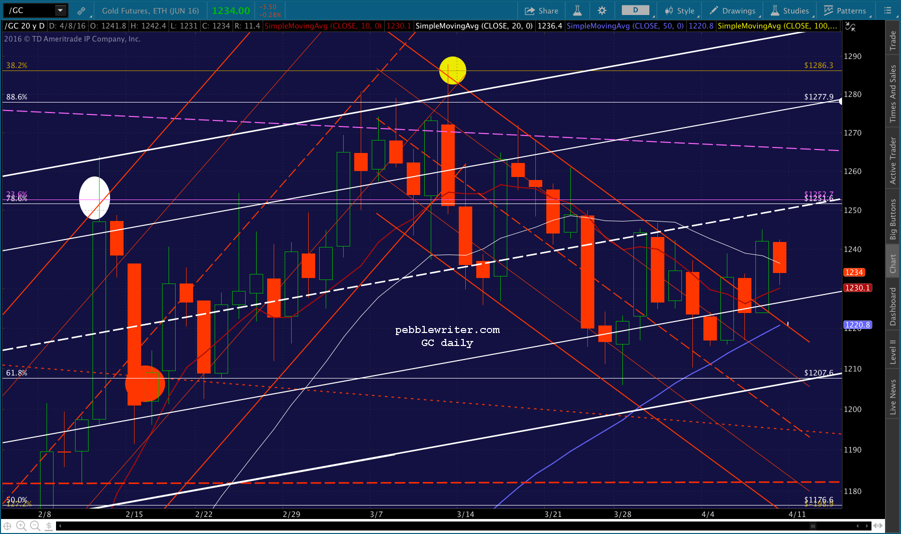 If it breaks above 1246, then the purple .618 at 1257 is a gimme. From there, we have potential resistance at 1270, which is also about where the purple midline currently resides.If it breaks above the purple midline, then 1379-1380 is the next logical target, perhaps in Sep/Oct. So far, it’s been doing a nice job of rising the rising moving averages, with the SMA50 around 1220 coming into play the last few days.