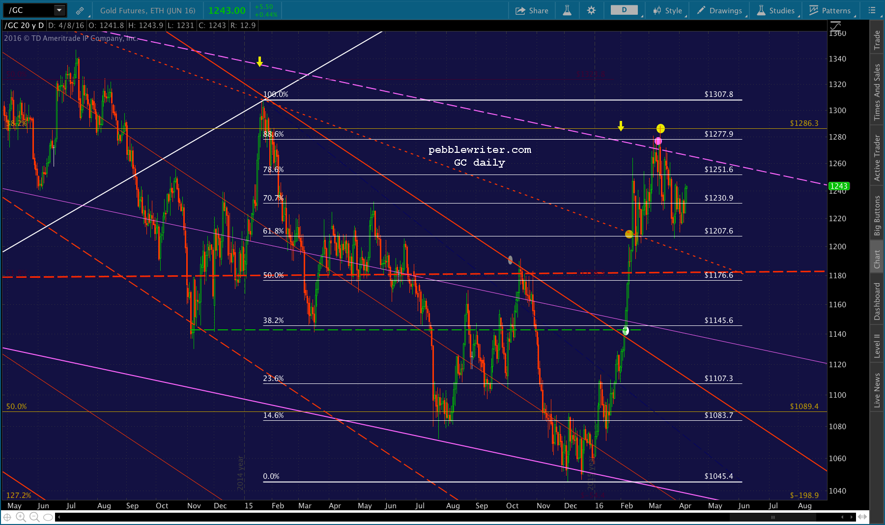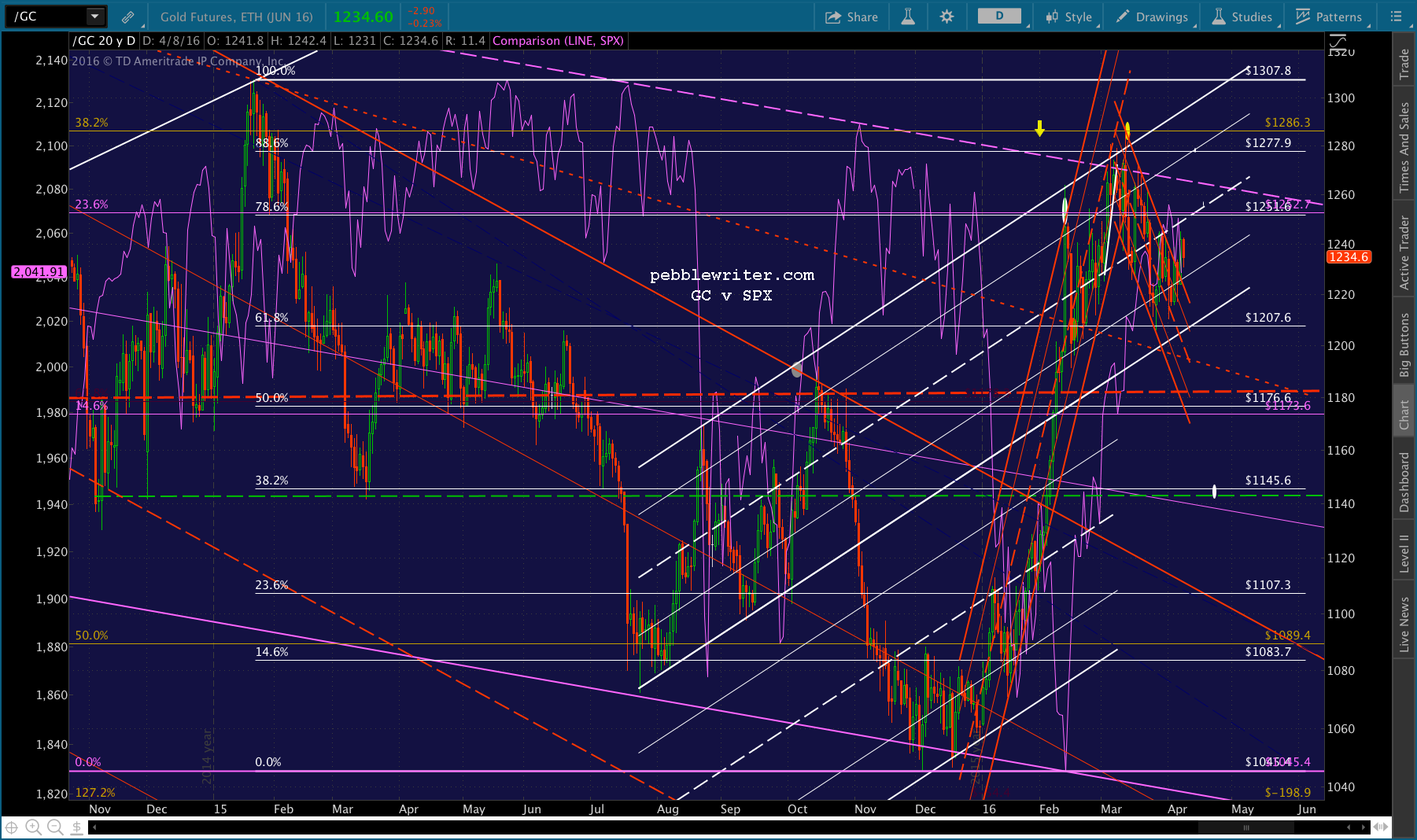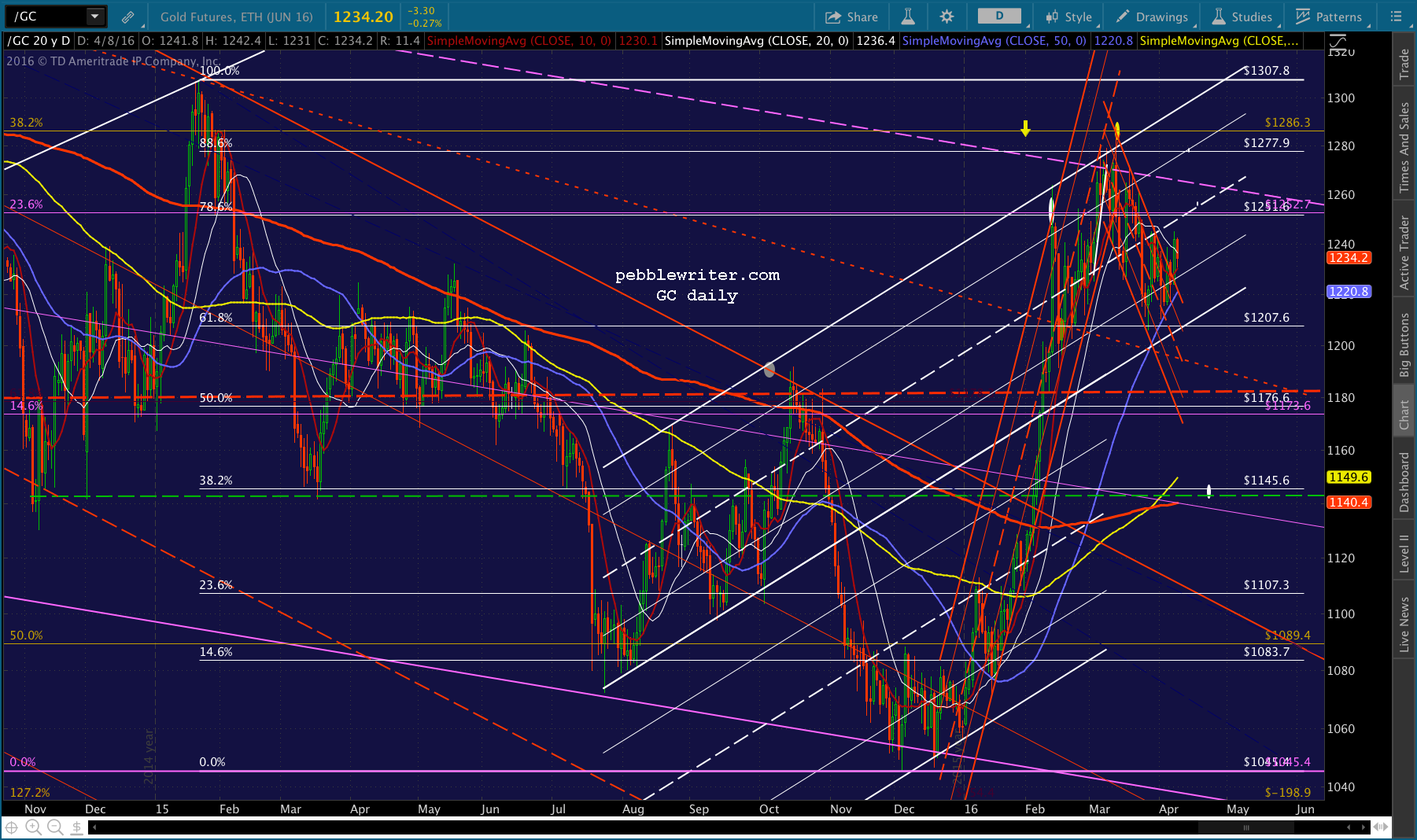 The drop from 1287 fell from the white .886 to the white .618. We draw the purple grid there, and note that the bounce to 1246 on Mar 30 represented a .500 retracement. Some corrective waves, that’s all you get.