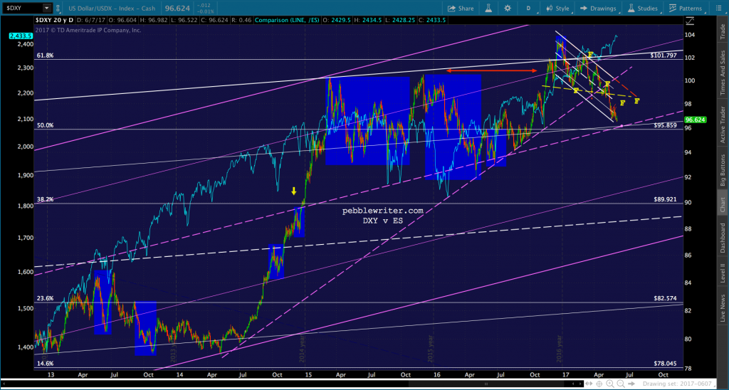 Clearly, equities benefited from DX pushing above the purple channel midline (the yellow arrow) in the first place.