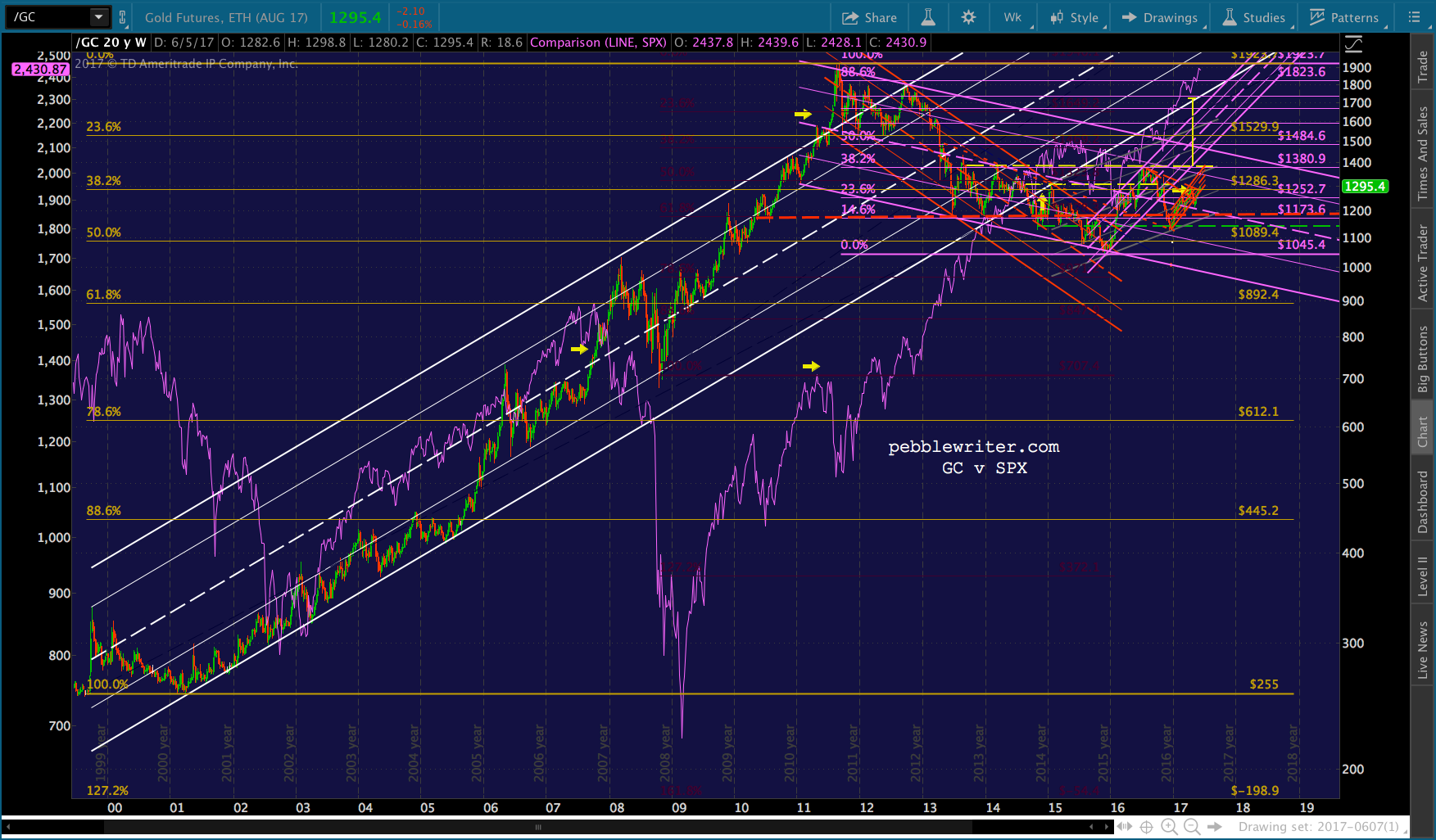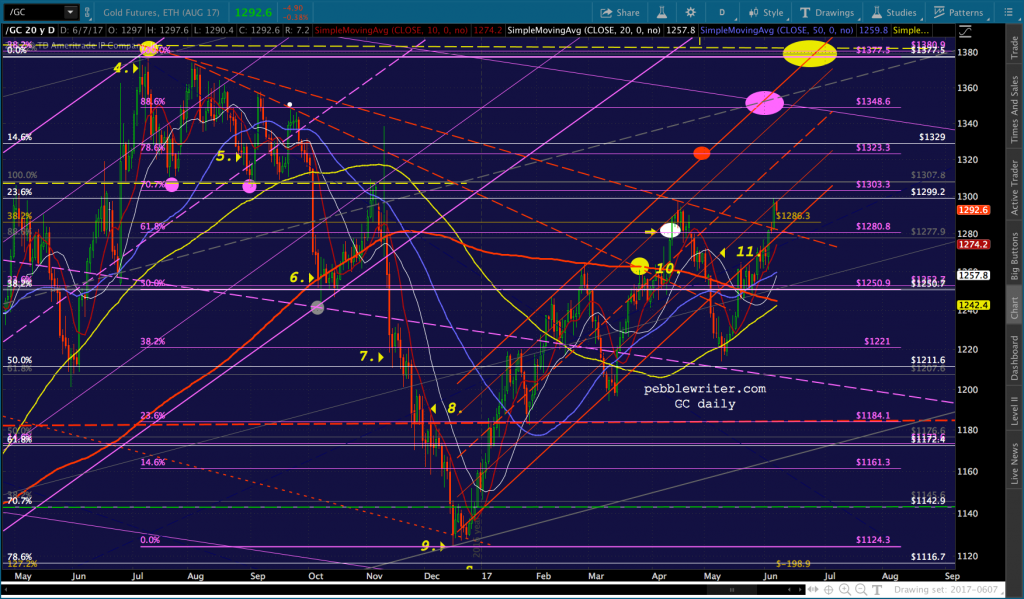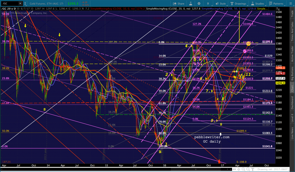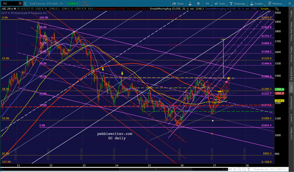 Remember, the purple target at 1348.60 is the: (1) .886 retrace of the drop from 1377 on Jul 6, 2016; (2) the .786 line of the falling purple channel; and, (3) the midline of the rising gray channel. And, the yellow target at 1377.50 is the neckline of a huge IH&S Pattern that targets 1721.