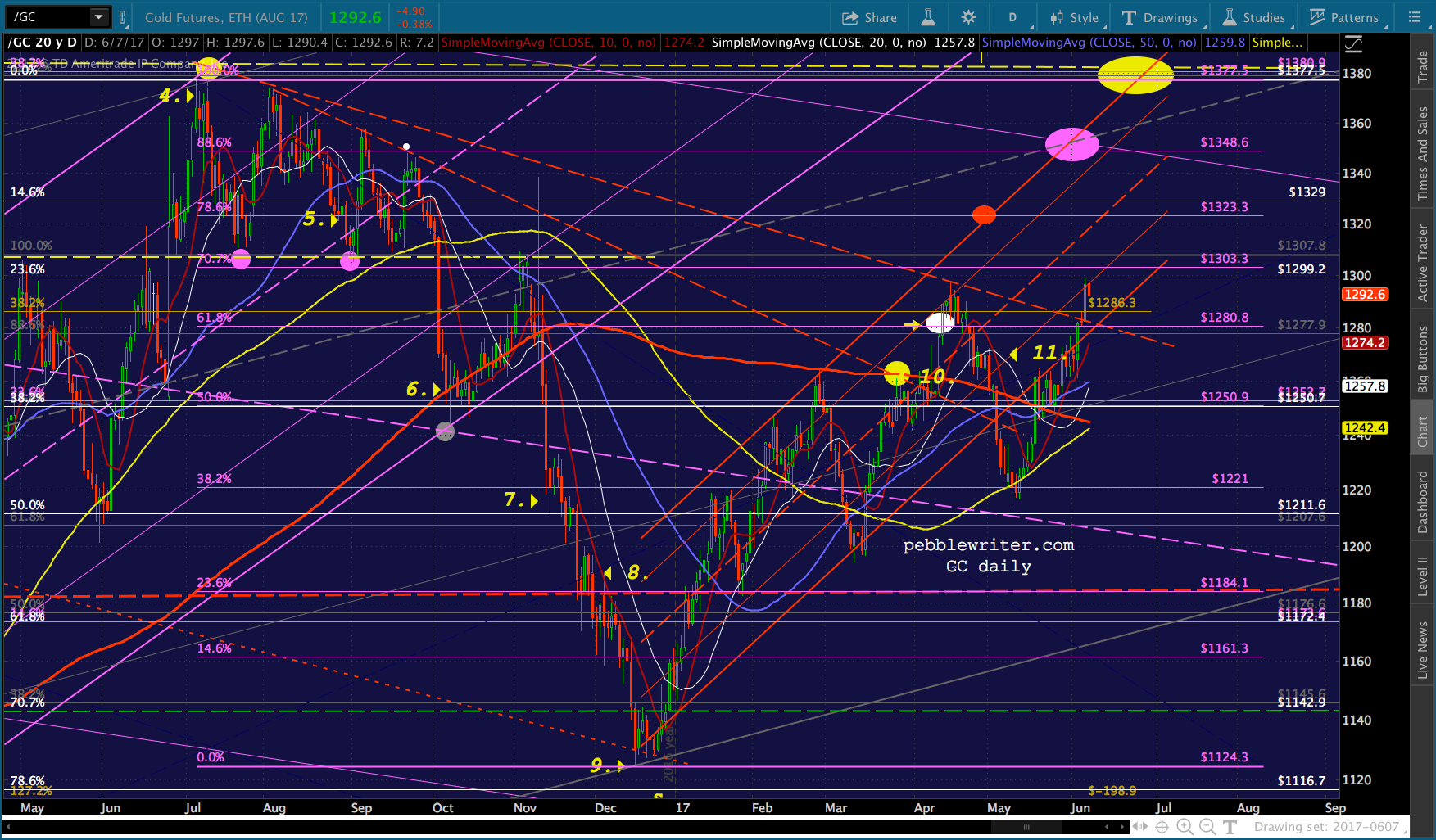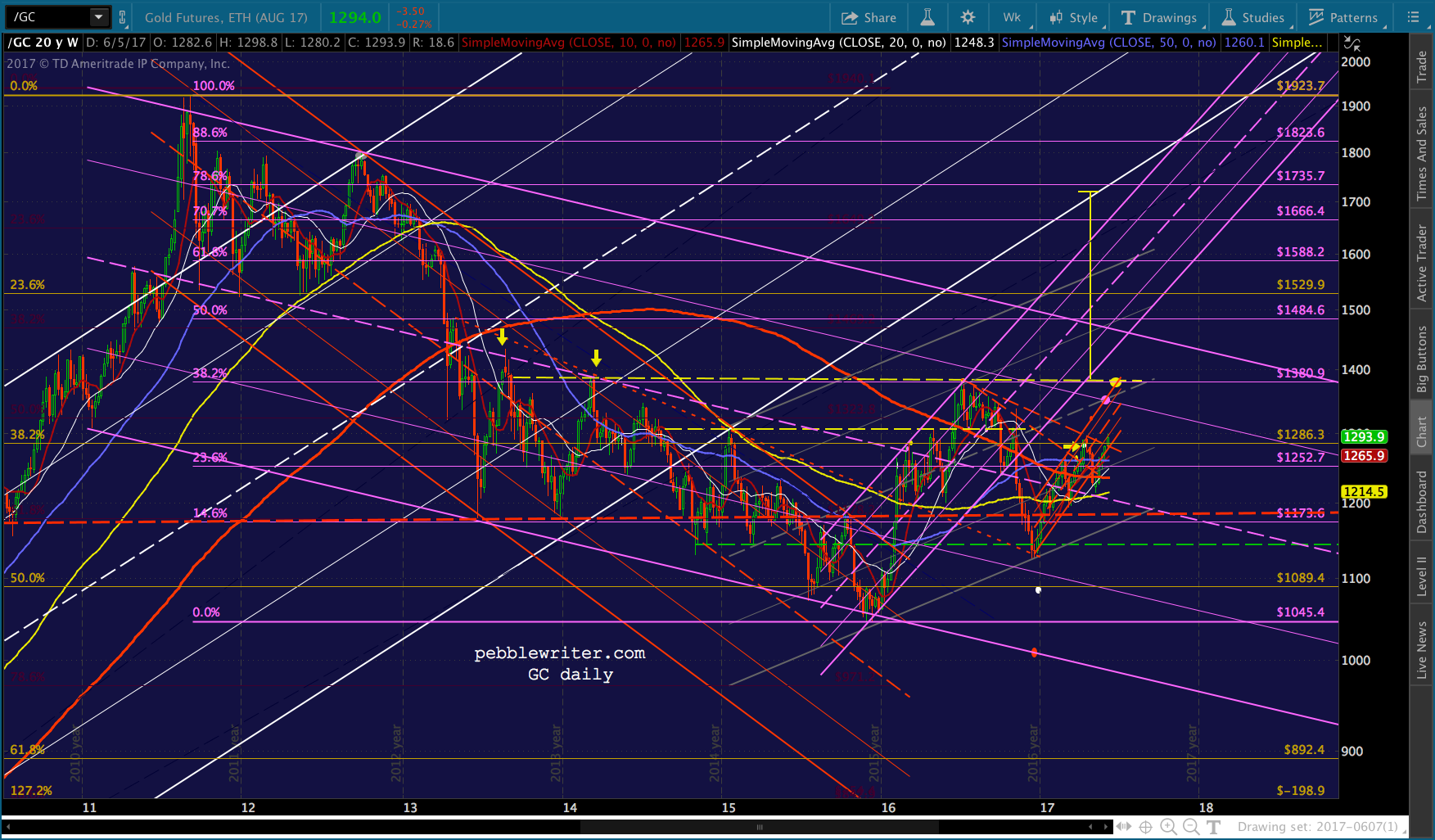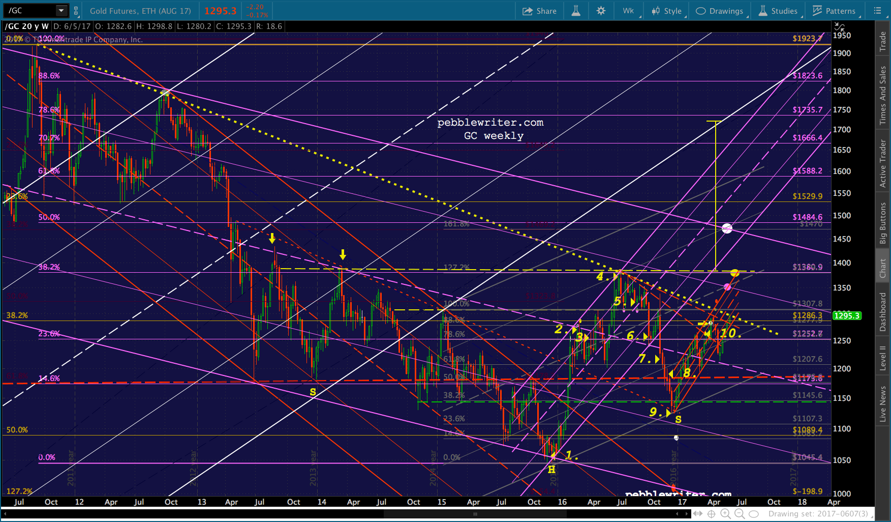 Remember, the purple target at 1348.60 is the: (1) .886 retrace of the drop from 1377 on Jul 6, 2016; (2) the .786 line of the falling purple channel; and, (3) the midline of the rising gray channel. And, the yellow target at 1377.50 is the neckline of a huge IH&S Pattern that targets 1721.
